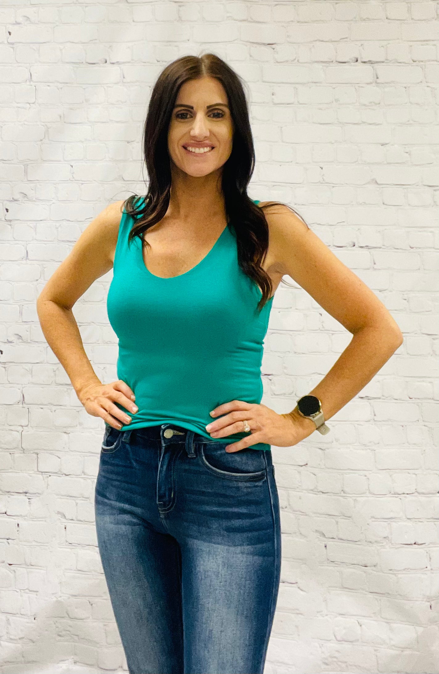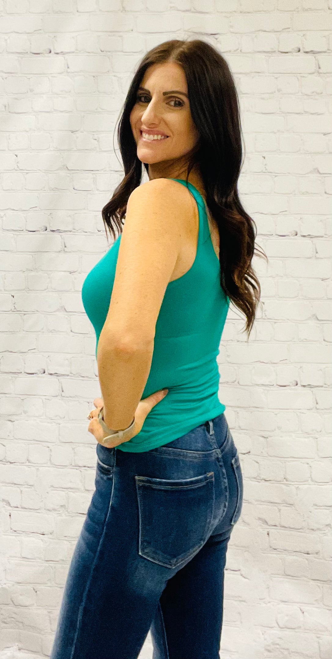 This vibrant green tank is a needed basic for your wardrobe. Layer it or wear it by itself. Featuring a scoop neckline, thick straps, and the most comfort ever.