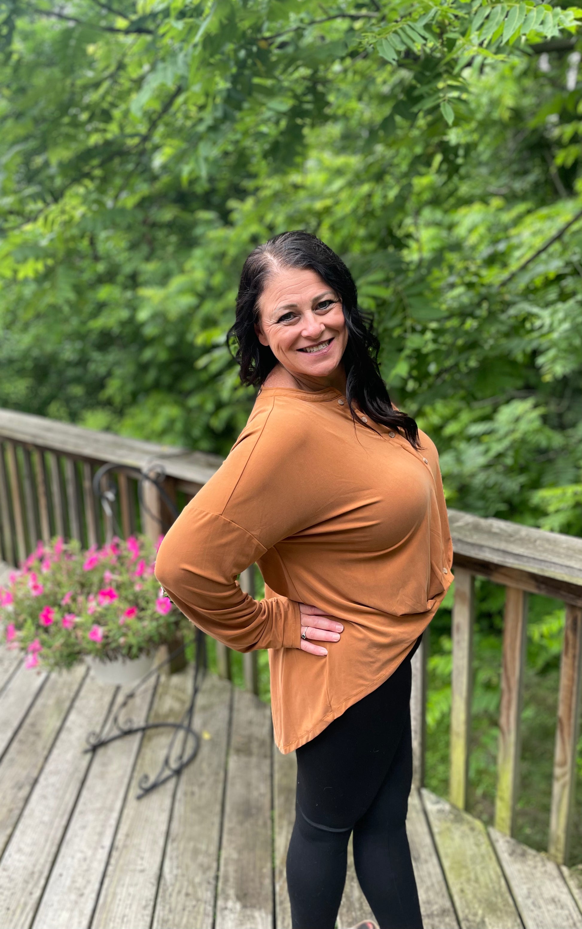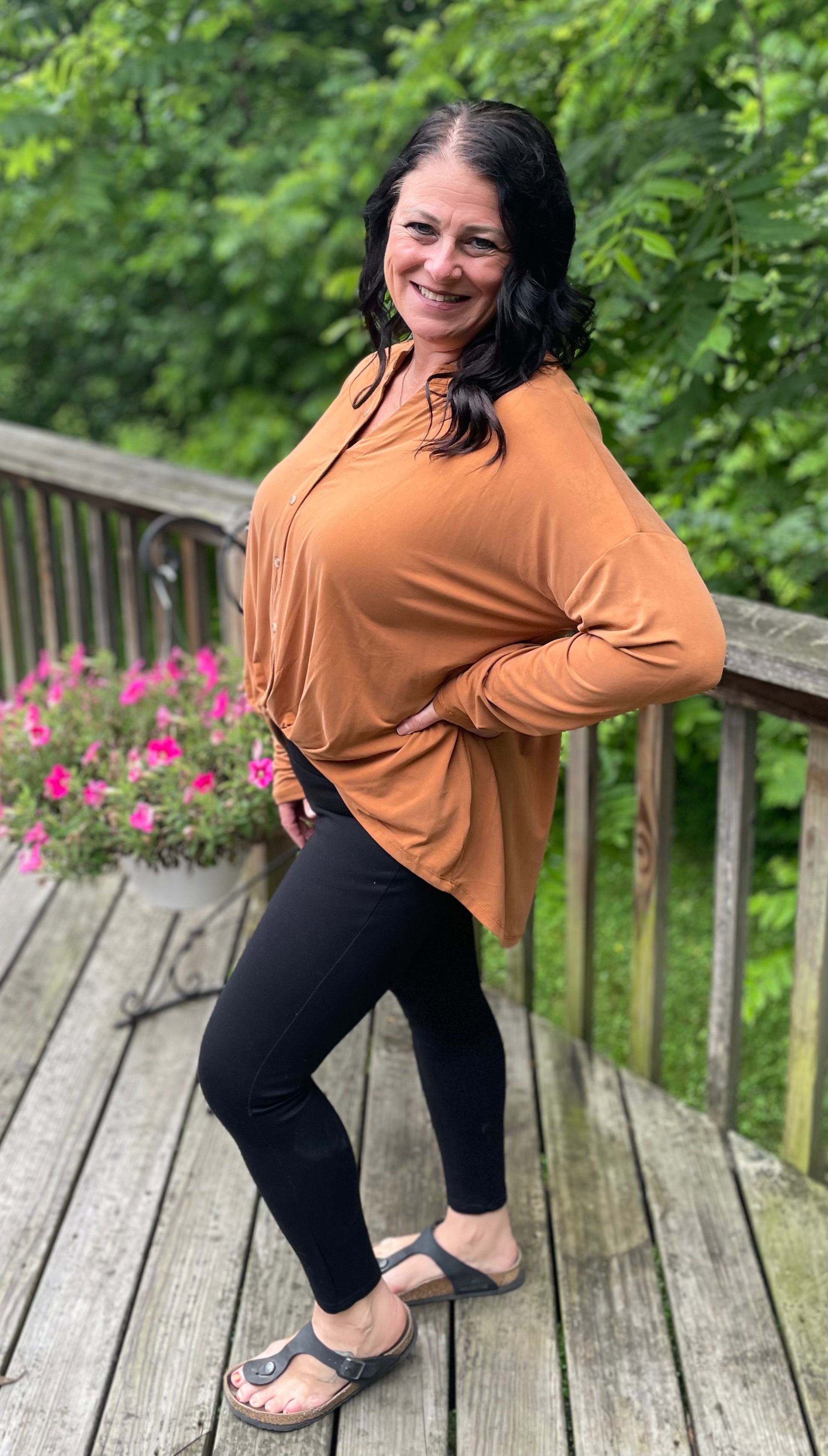 This burnt orange blouse brings playful charm with its soft, stretchy, and bouncy fabric that moves with you. Featuring long sleeves and a flattering V-neck, it’s pinched in the front for a stylish tucked-in look. The nonfunctional buttons add a fun, decorative touch without the fuss. Perfect for adding a pop of color and comfort to your wardrobe!