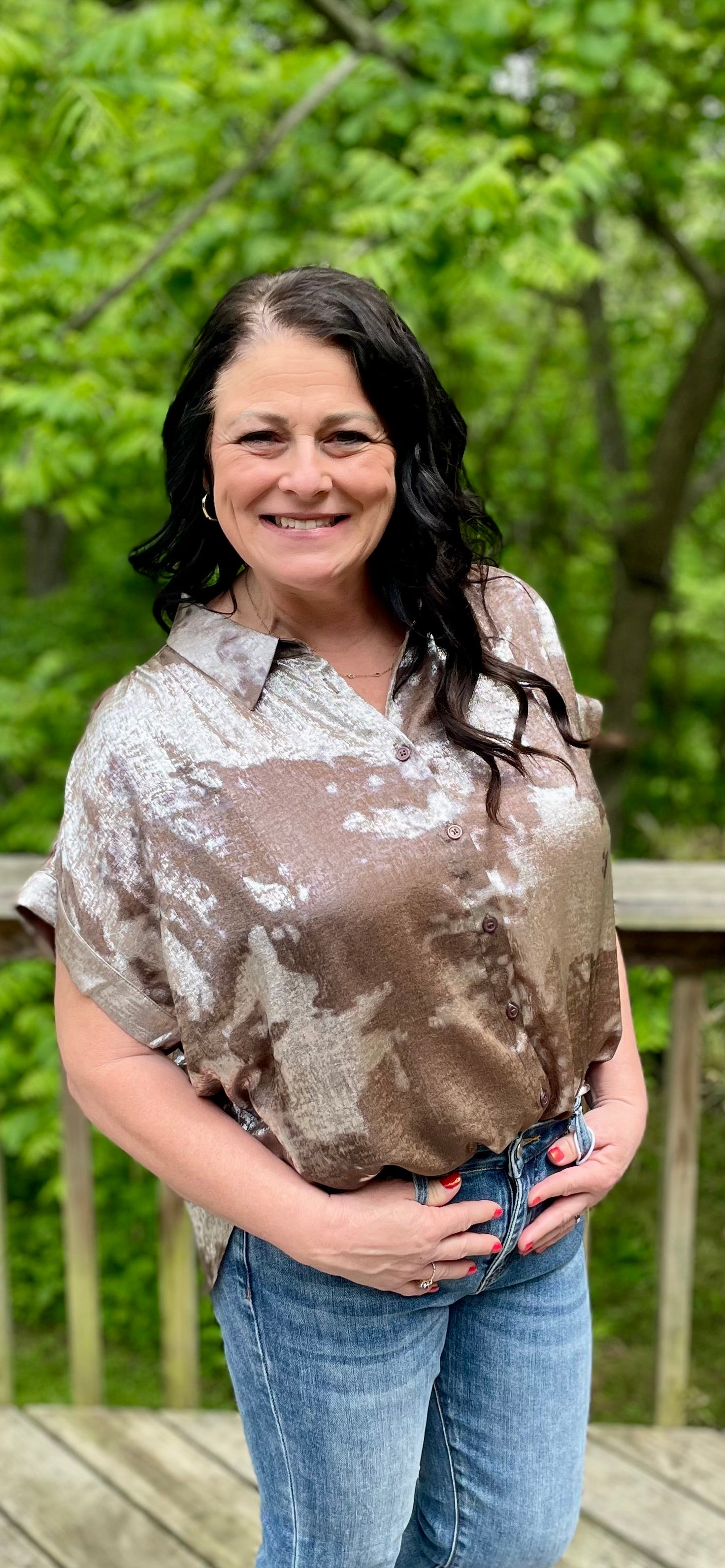 Introducing our new Button Up Shimmer Top, perfect for a night out or adding some sparkle to your everyday look. This flowy top is true to size and features a shimmery metallic fabric that adds a touch of playfulness. The longer back adds a comfortable and flattering fit. Trust us, you'll want this top in your wardrobe!