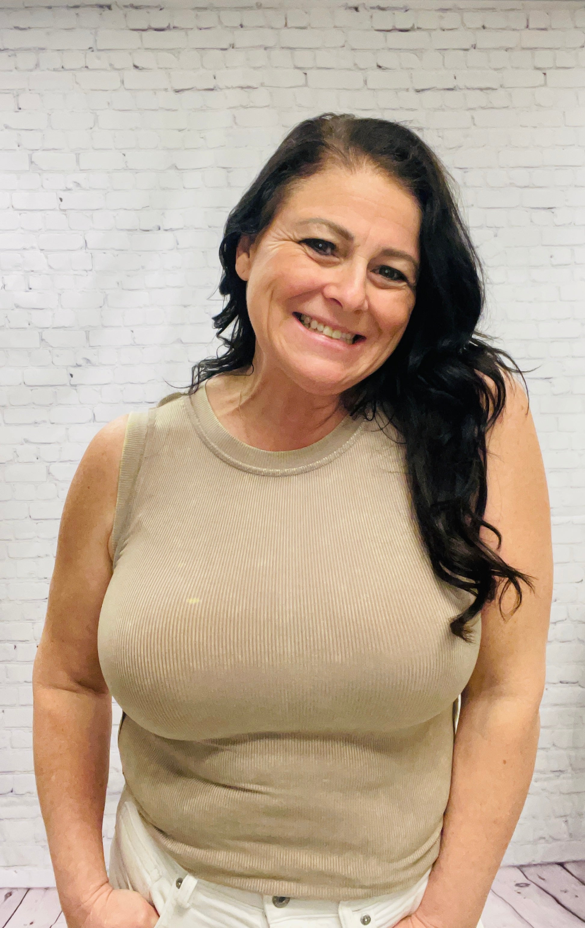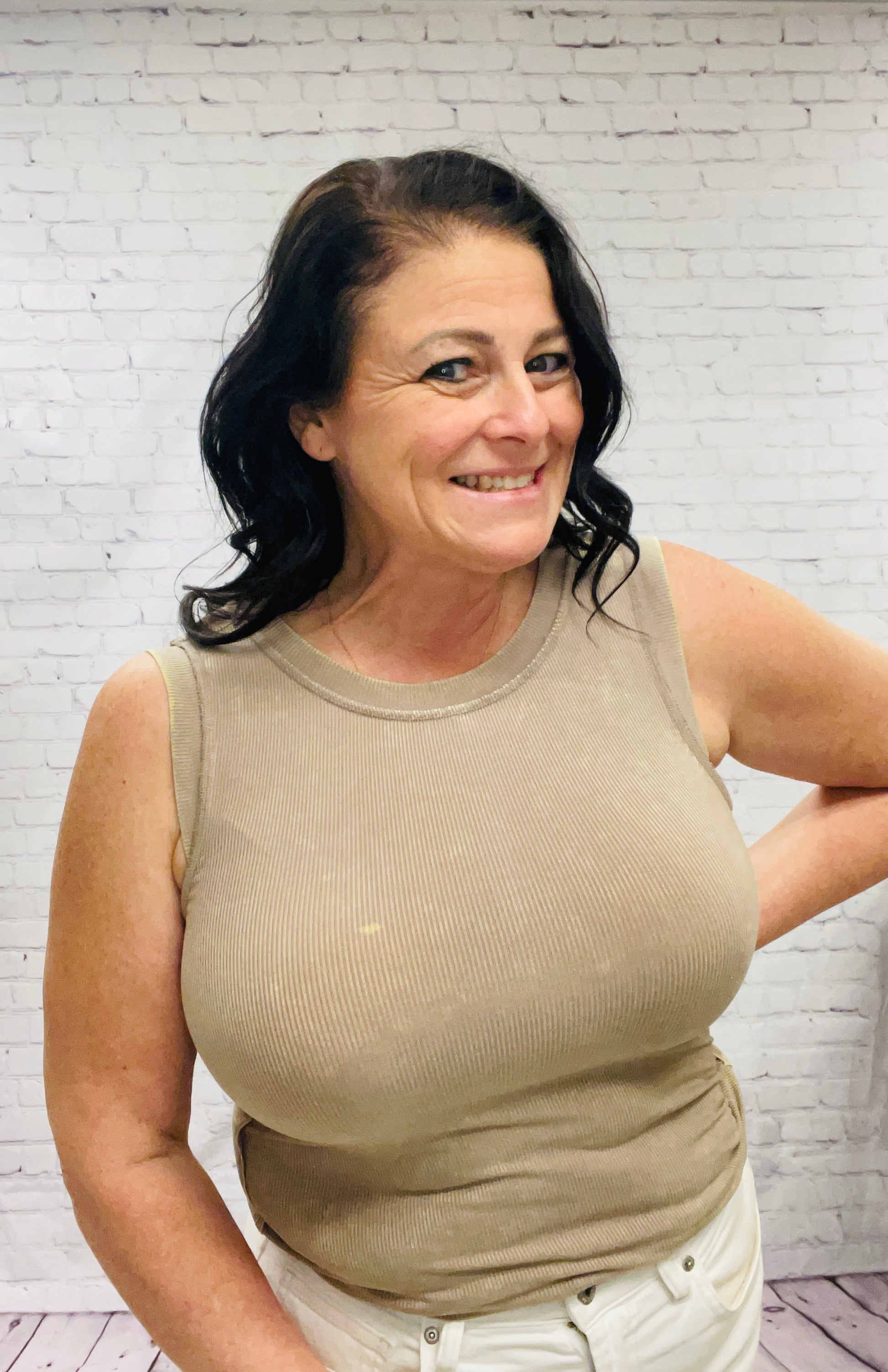 This tank top is a sleek camel color, ribbed with a slightly sheer, acid wash effect. It has a casual sleeveless cut with a rounded neckline, making it perfect for layering wearing solo on warm days. The lightweight fabric gives it a breezy, effortless vibe.