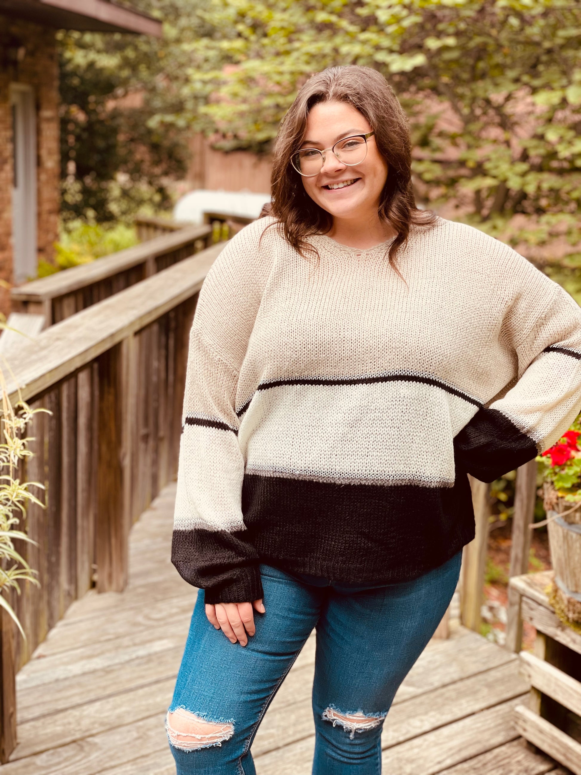 This is a very cute lighter weight knit sweater! It features a streak of silver thru the color blocking!