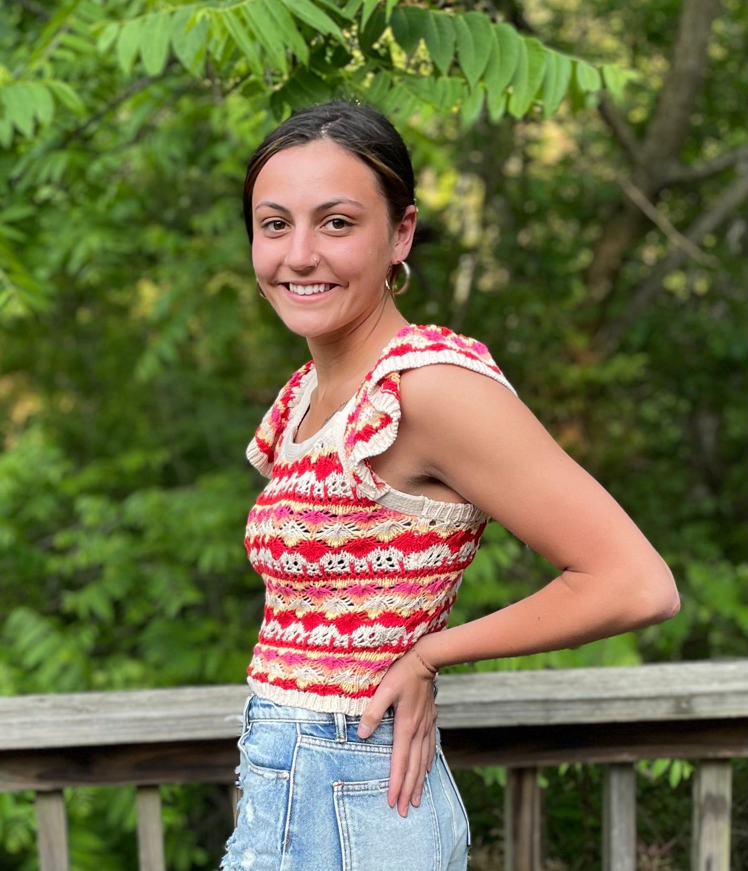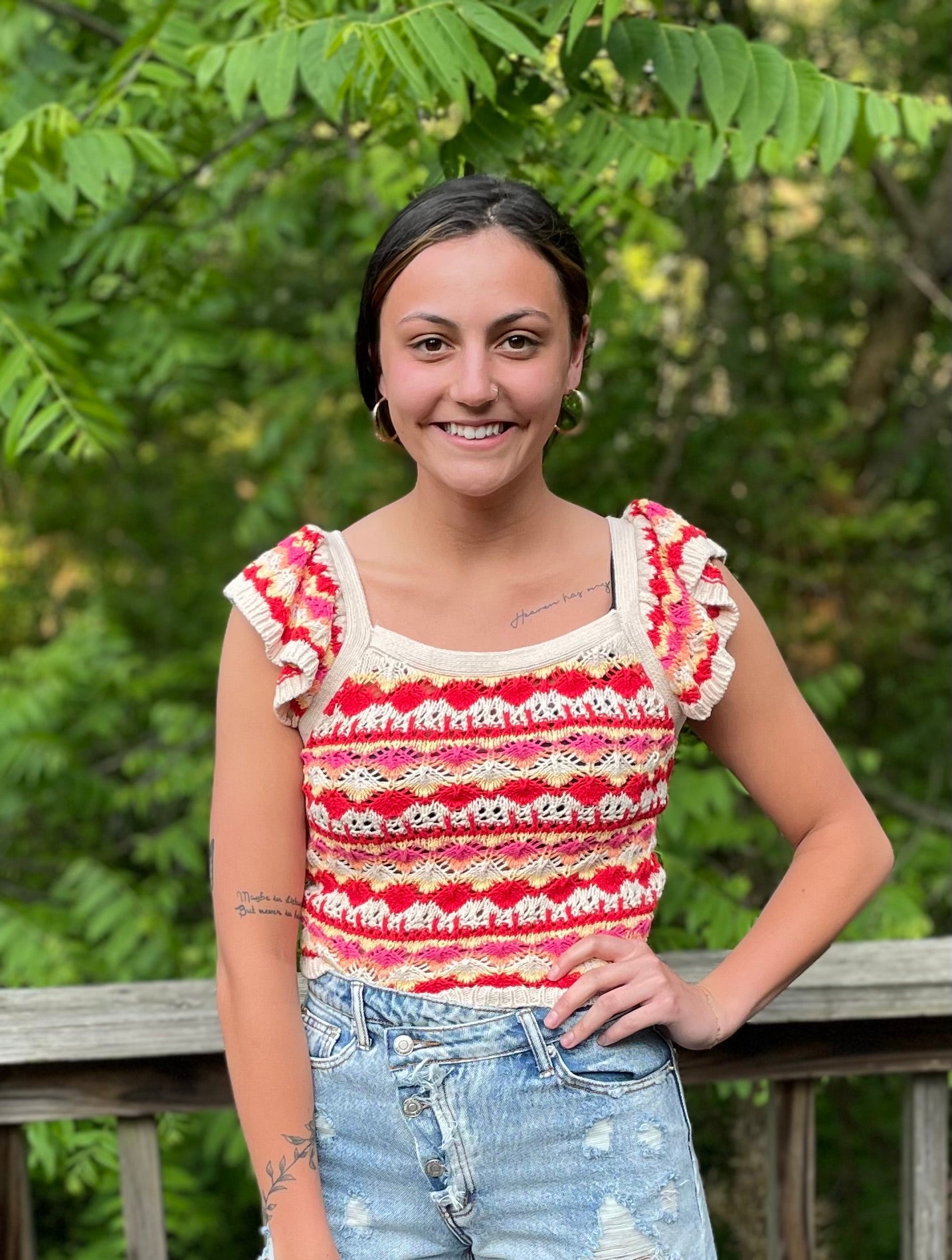 Beautiful bright colors of pink. red. and yellow. Ruffled sleeves. Cropped.