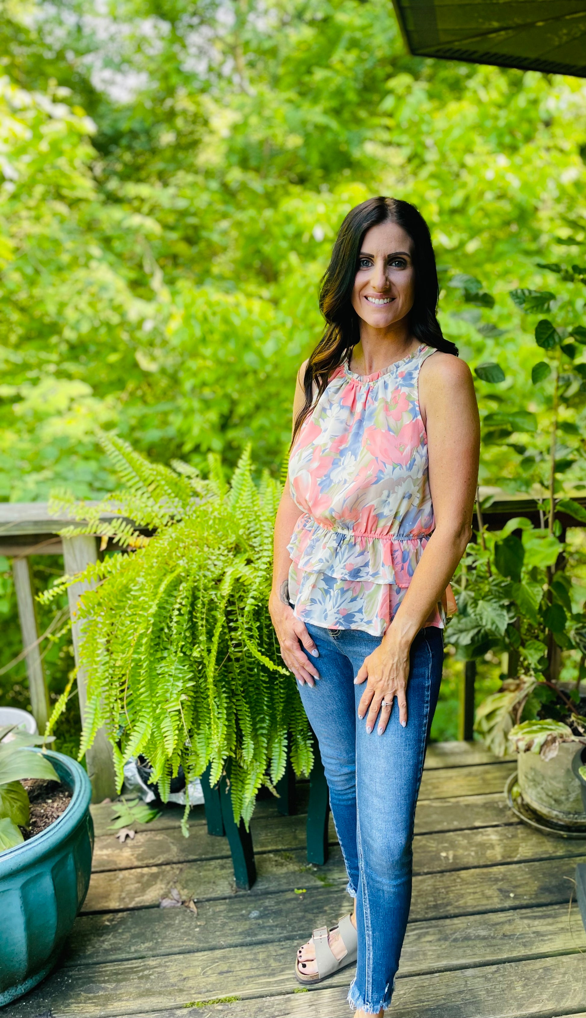 This stunning floral tank features a halter neck and ruffles on the bottom as well as on the collar. This tank is a bit cropped.