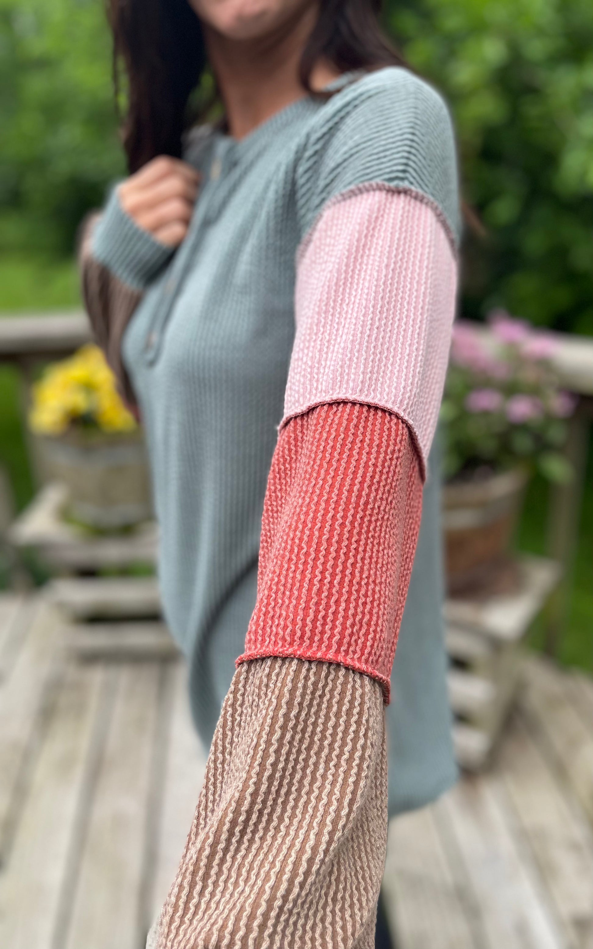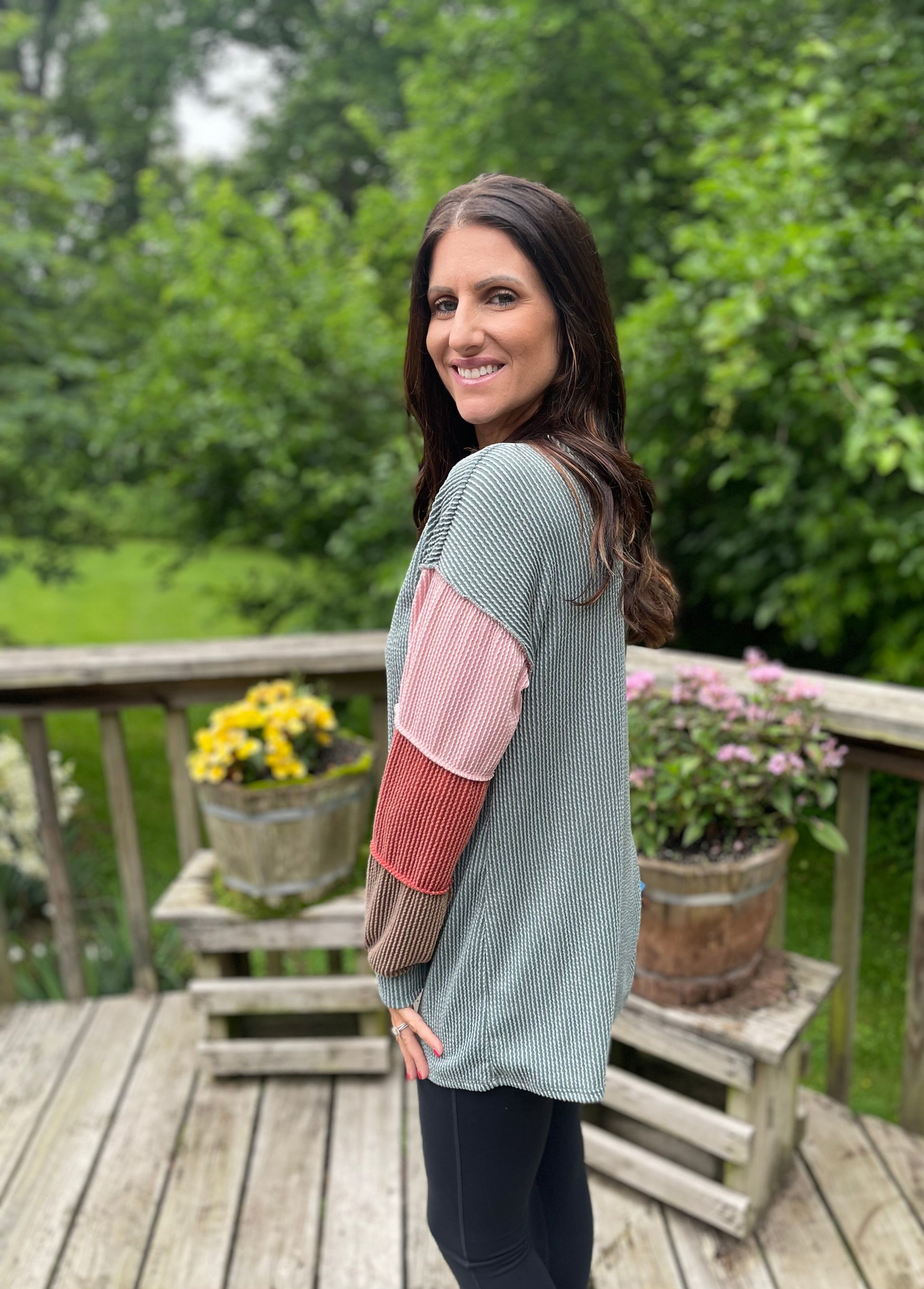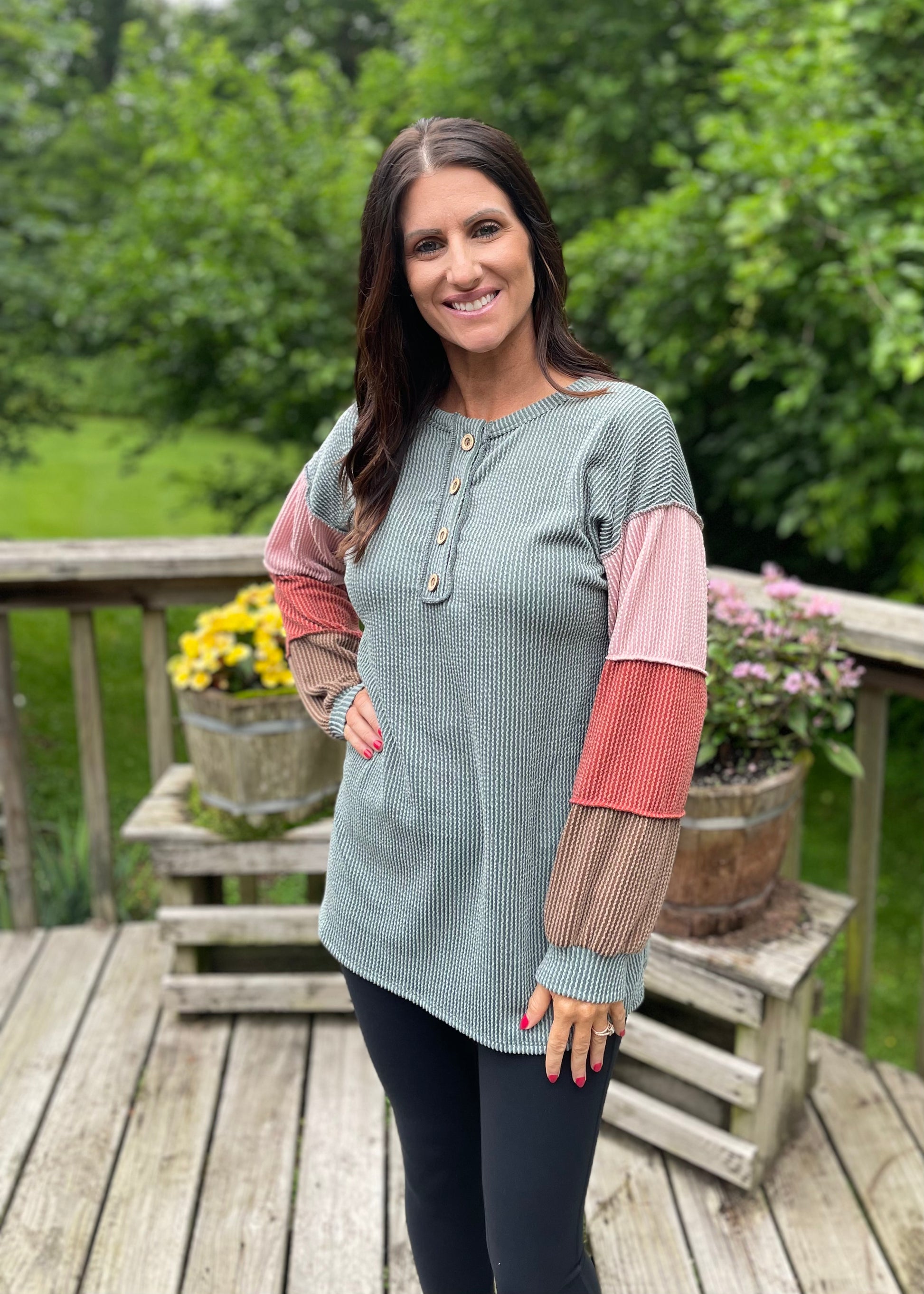 This Green Ribbed Top brings playful charm with its vibrant color block design and button V-neck detail. Crafted from a lightweight, bouncy fabric, it feels soft and stretchy for all-day comfort. Perfect for adding a fun twist to your casual wardrobe!