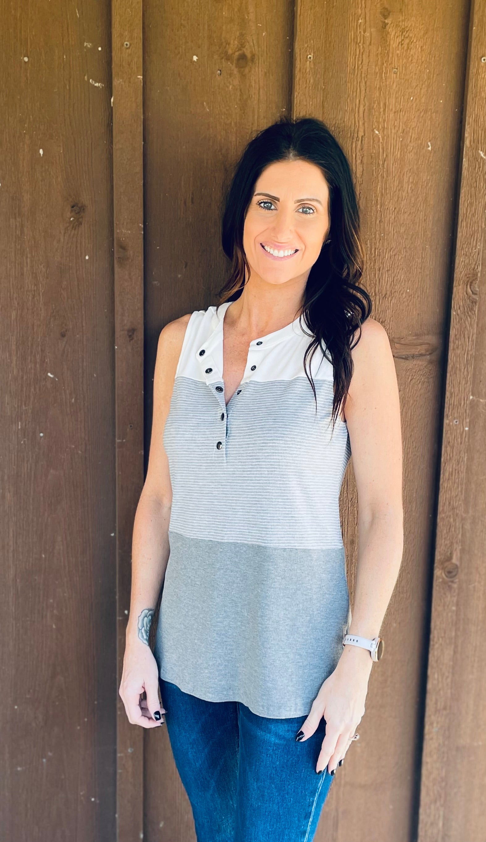 This is a very attractive color block of greys and white! It features a snap down front placket! It fits true to size!