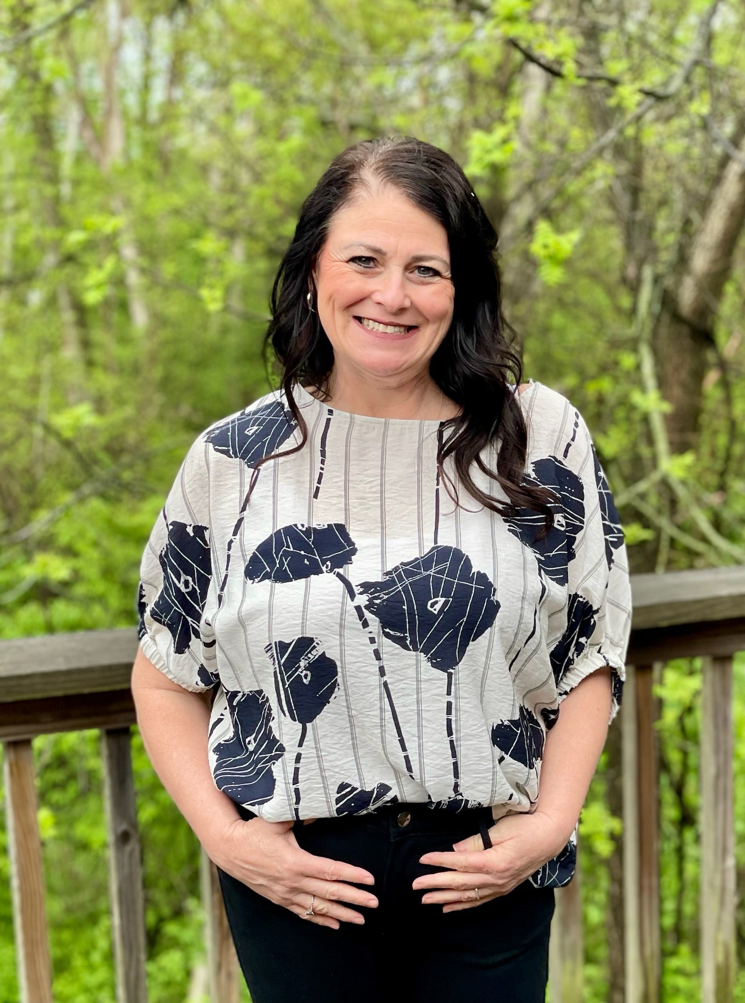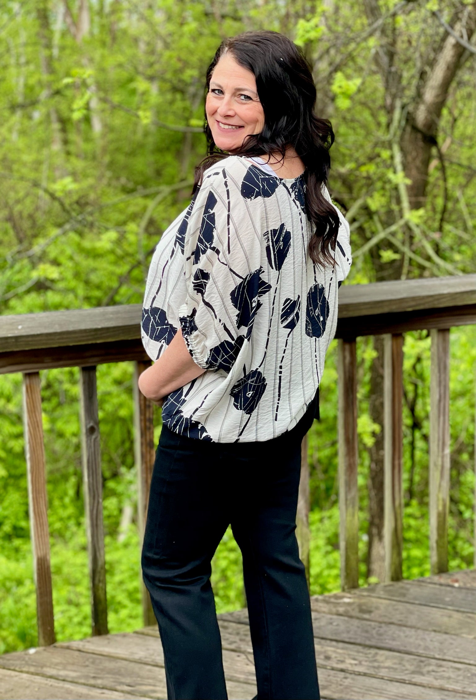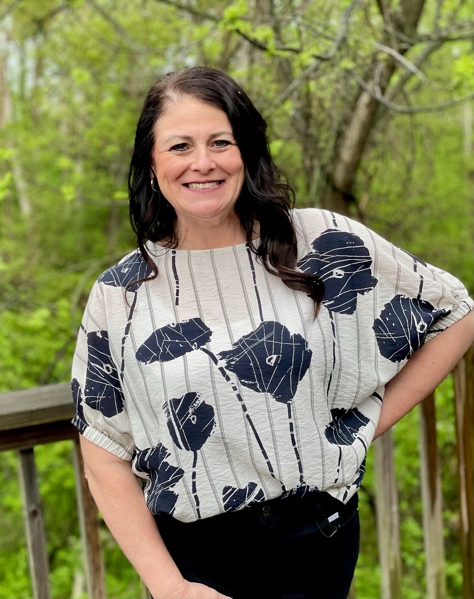 Introducing our Indigo Bloom Top - a playful and flowy piece with large flowers and stripes. The balloon-like sleeves add a fun touch, while the elastic cuff ensures a comfortable fit. Embrace your quirky side and bloom in this top!