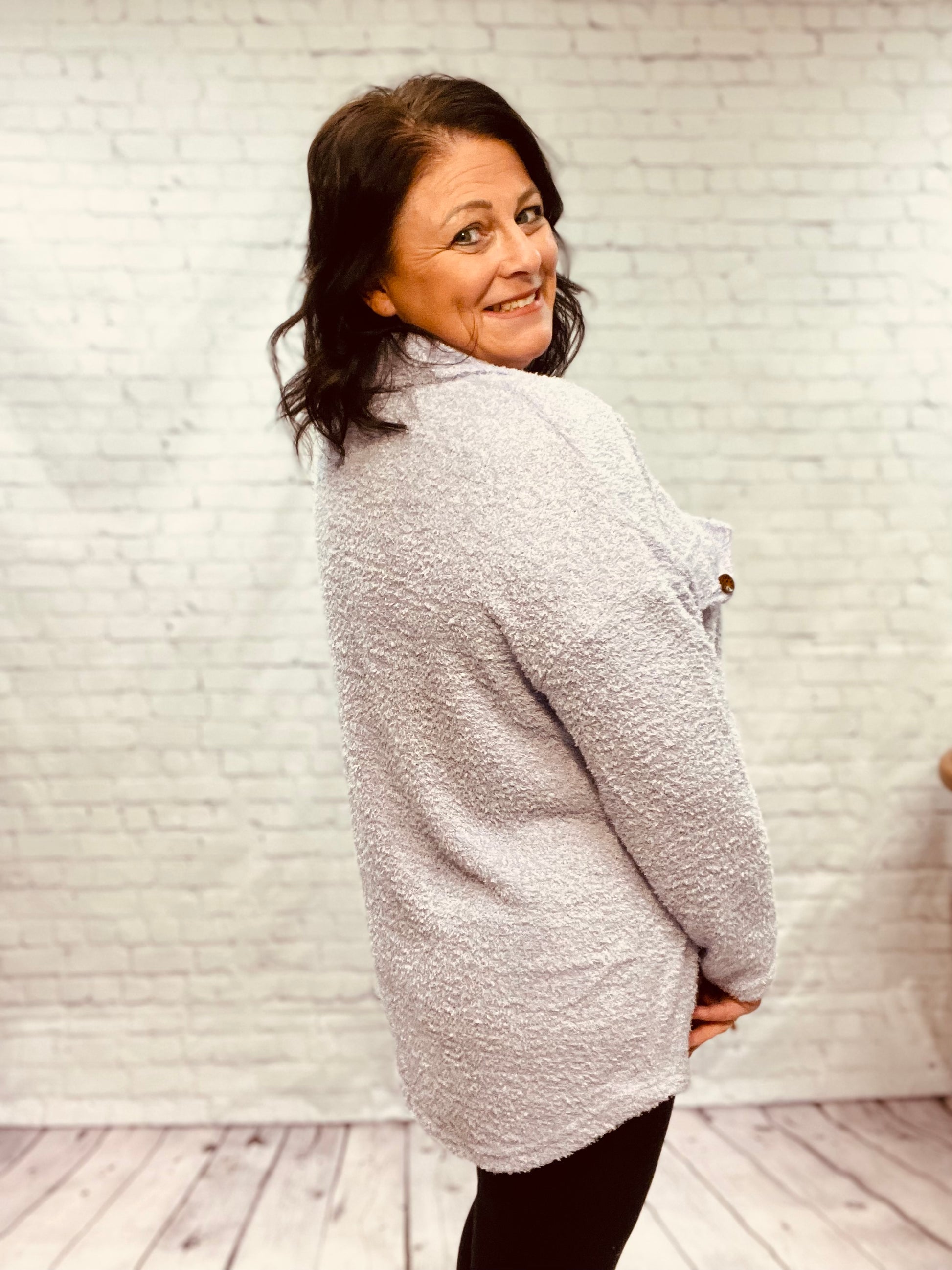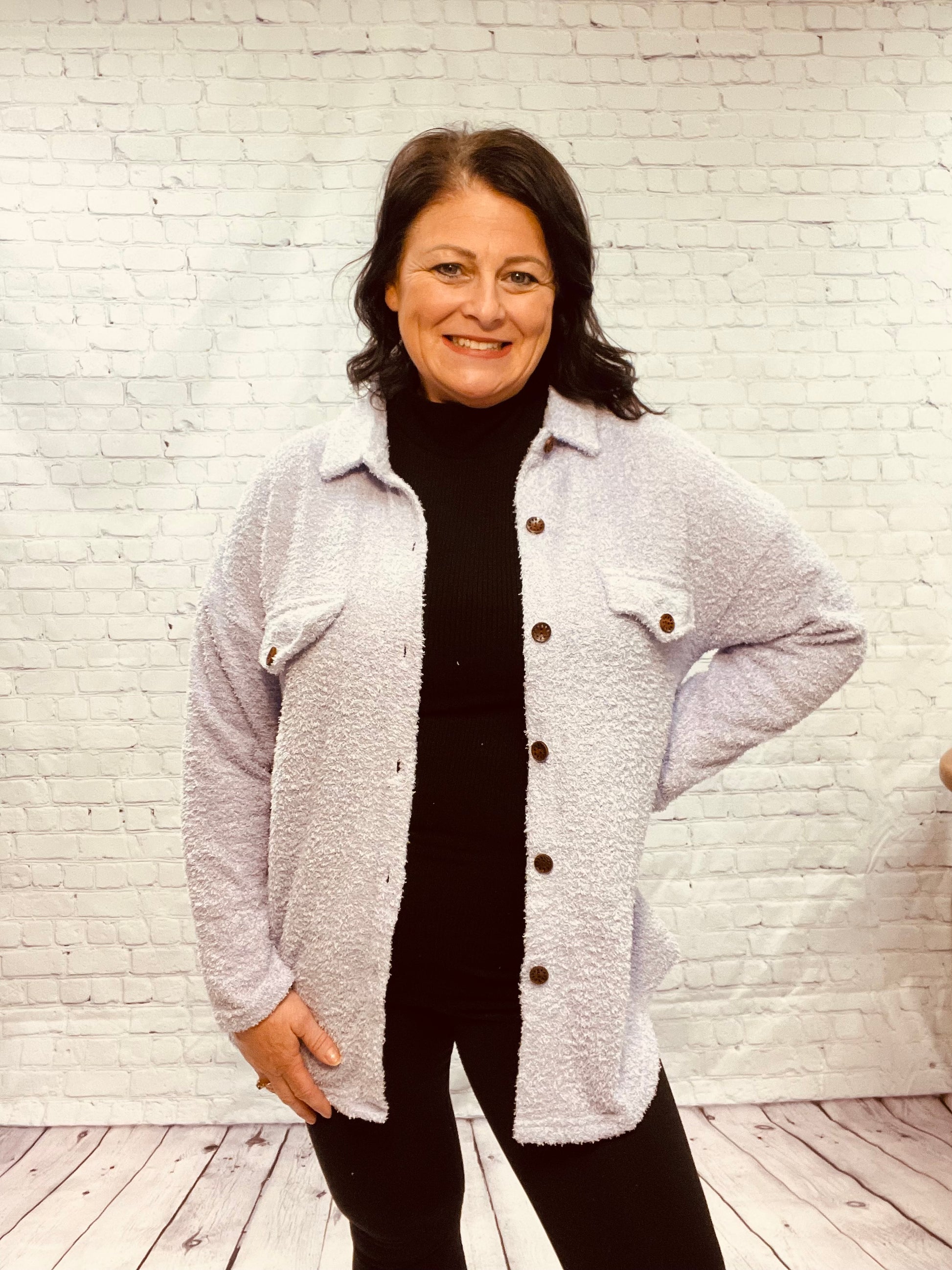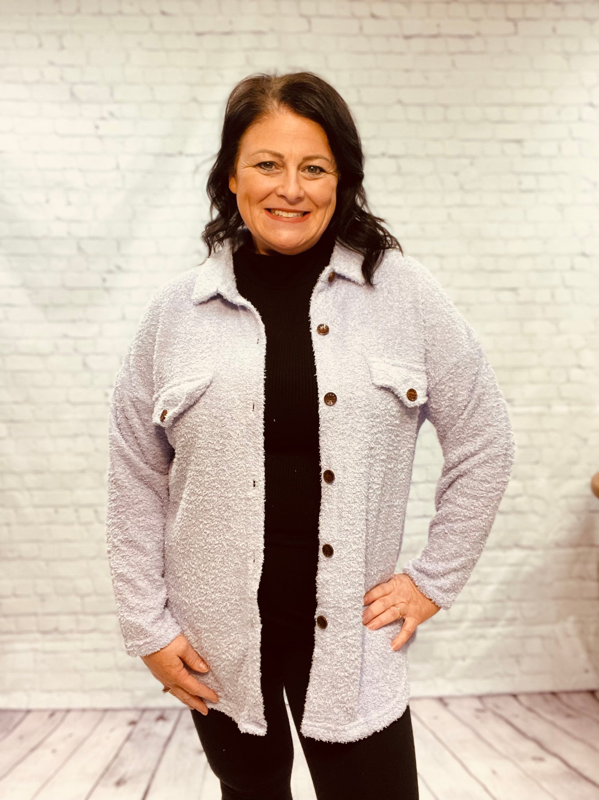 This is a very soft terry cloth material. It has front pockets and buttons down the front!