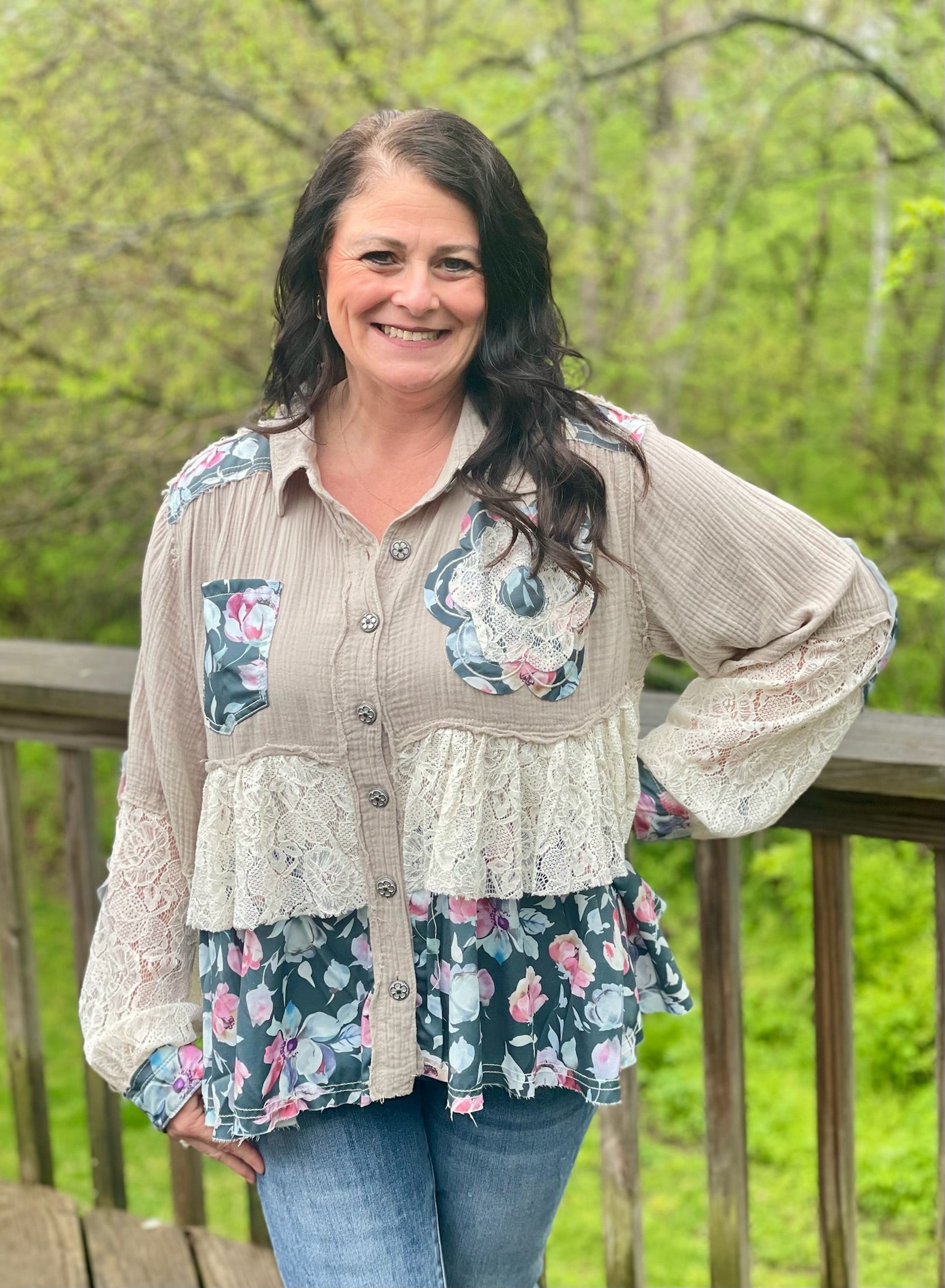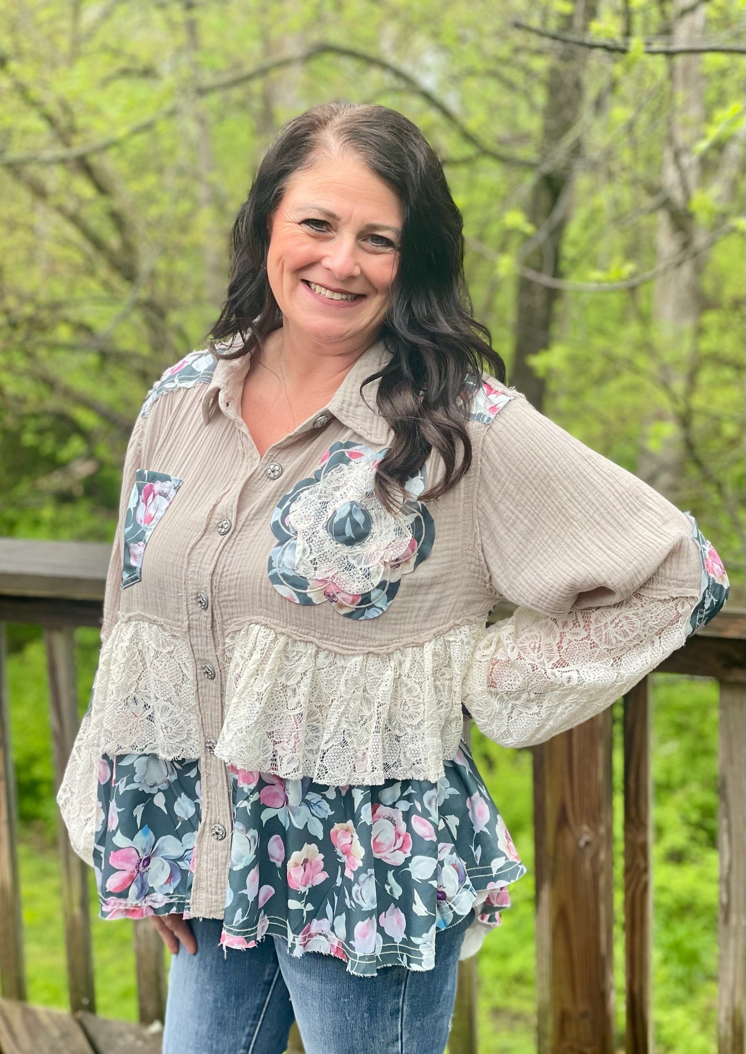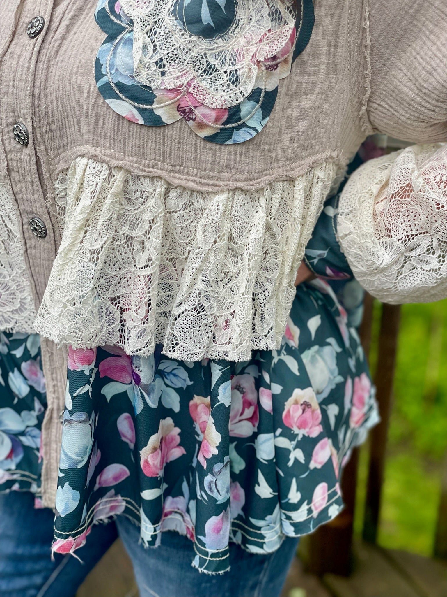 Looking for a blouse that's bursting with personality? Look no further! This Meadow Breeze Blouse features playful lace, charming flower buttons, delicate ruffles, and a flirty oversized fit. Not to mention the stunning flower detailing on the sleeves and chest pockets, and the unique balloon-like sleeves that add a touch of whimsy. This blouse is truly one-of-a-kind, just like you!