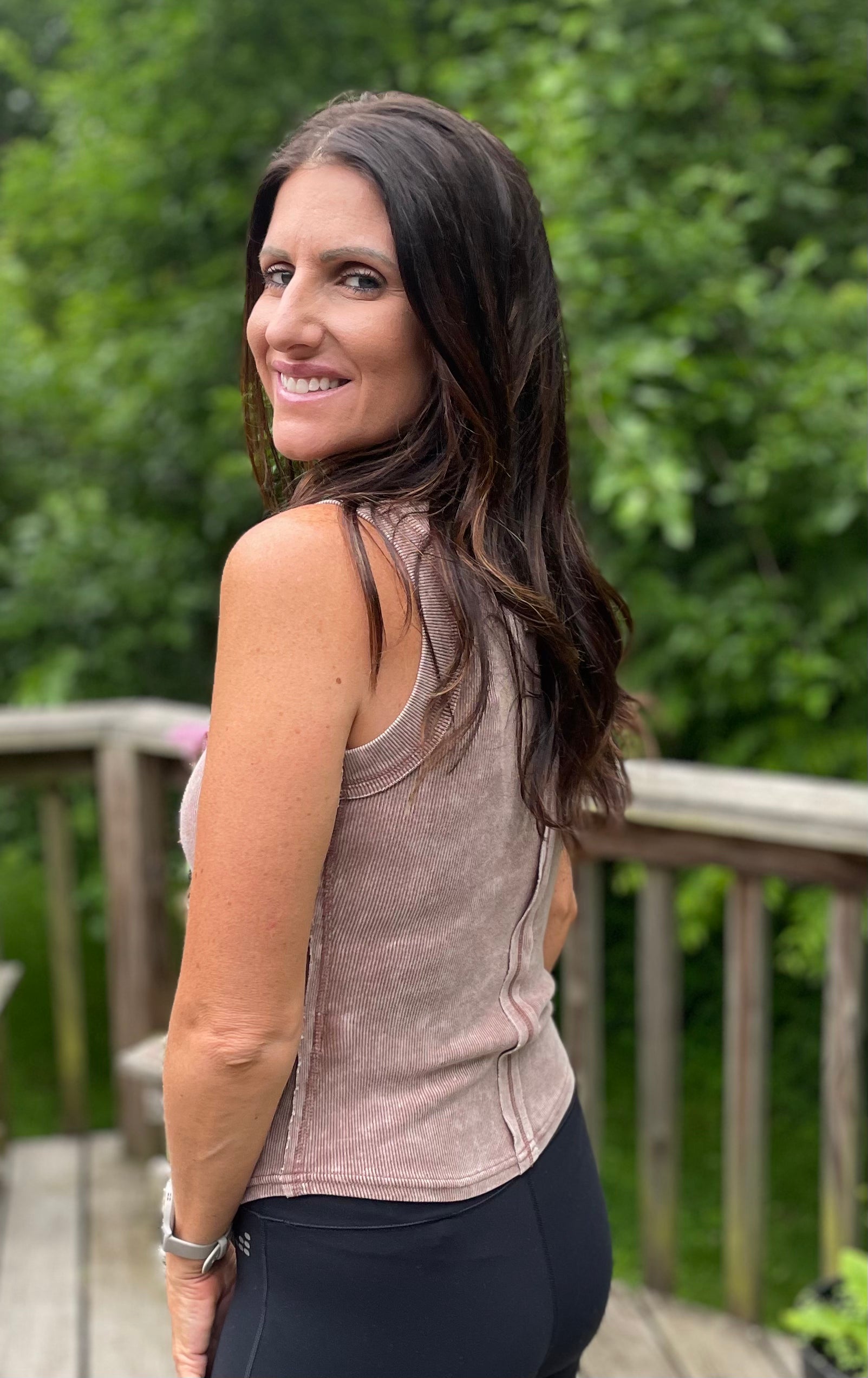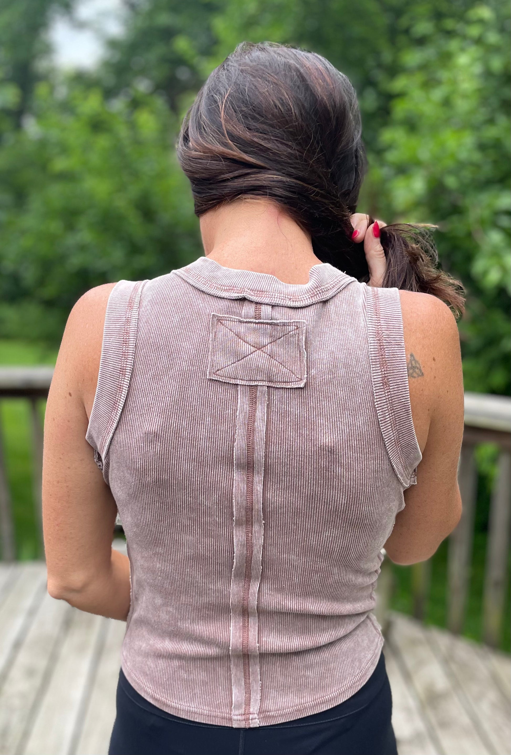 This brown button-down tank is your new go-to for effortless style. Featuring a ribbed, cropped fit with thick straps and a playful V-neck, it’s designed to keep you comfy and confident. The acid-washed fabric and exposed seams add a cool, lived-in vibe, while the stretchy, soft material moves with you all day long. Perfect for layering or wearing solo, this tank brings fun and flair to any outfit.