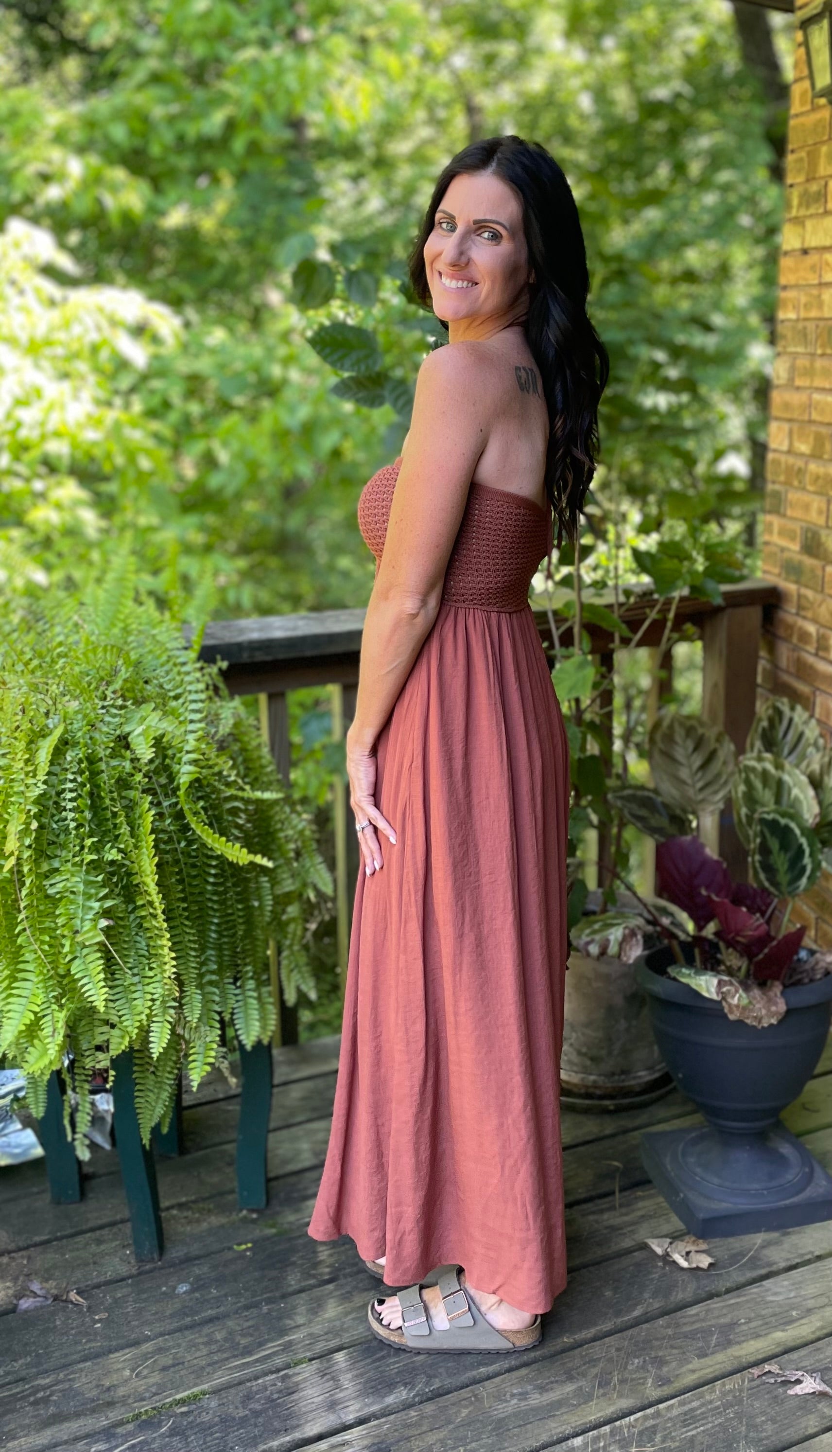 This is a beautiful dress that features a beaded strap that ties in the back. It also has a smocked bodice that fits nicely!