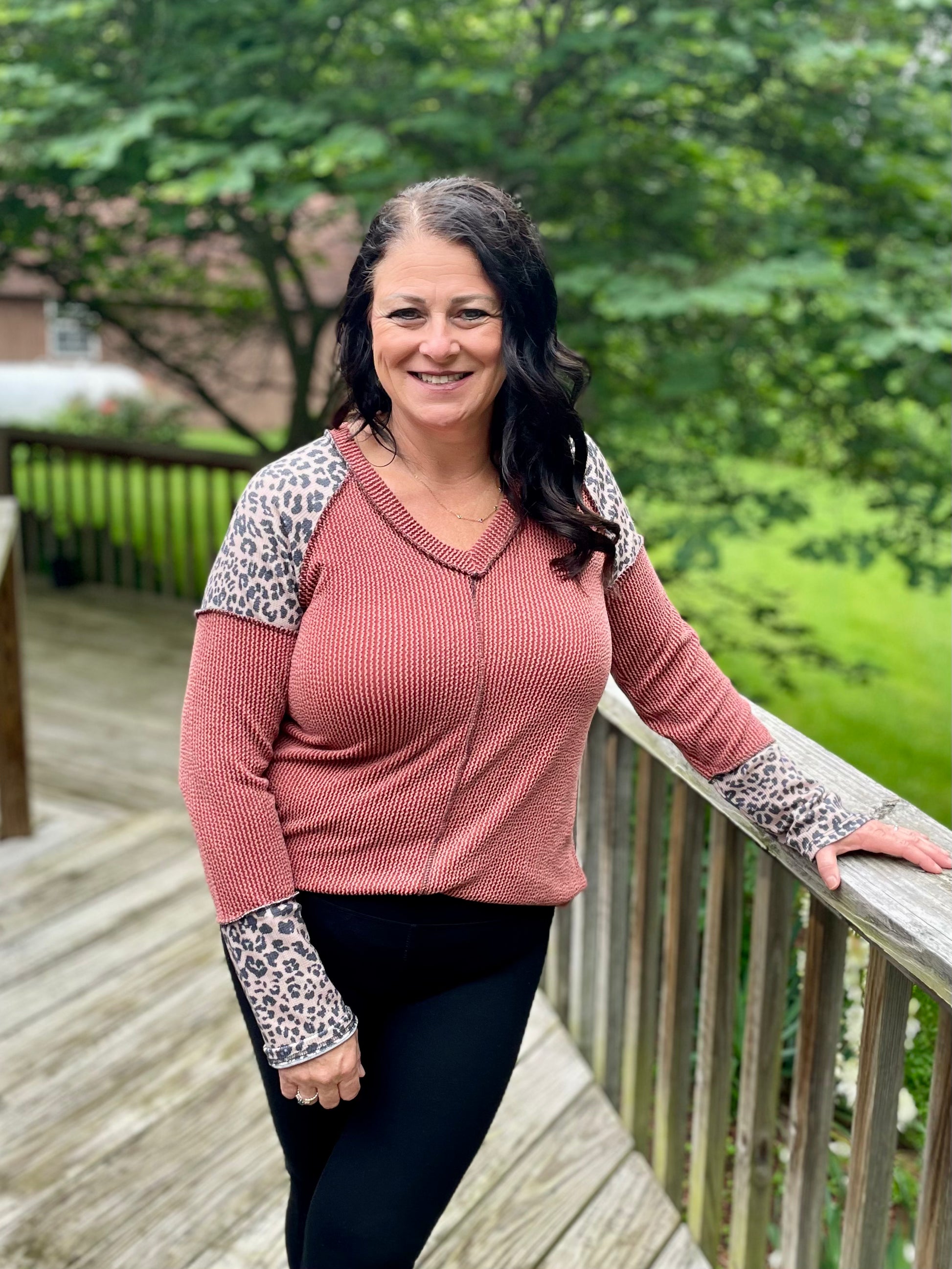 Embrace cozy style with this ribbed long sleeve featuring a playful color block pattern in warm rust tones and a bold leopard accent. Super soft and stretchy, it offers a flattering V-neck and a chic seam down the middle for added flair. Perfect for layering or wearing solo, this top brings fun and comfort to your everyday wardrobe.