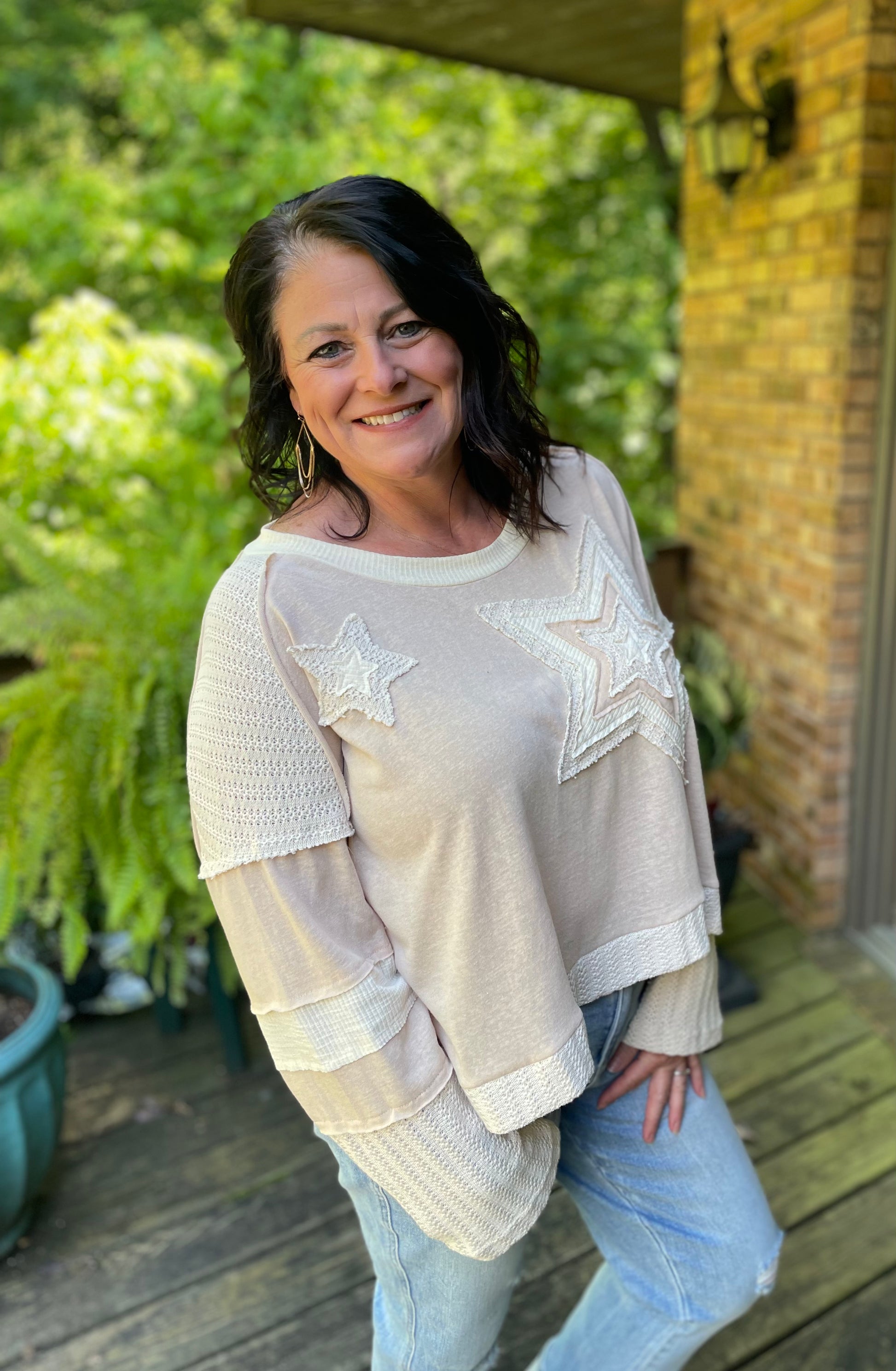 Elevate your casual style with this gorgeous beige oversized sweater featuring intricate star appliqué details for a touch of effortless charm. Designed for comfort and style, this sweater has a soft, lightweight fabric with textured knit accents on the sleeves and trim, making it perfect for layering or wearing on its own. The relaxed fir and wide neckline offer a flattering silhouette, while the long sleeves with ribbed cuffs add a cozy touch.