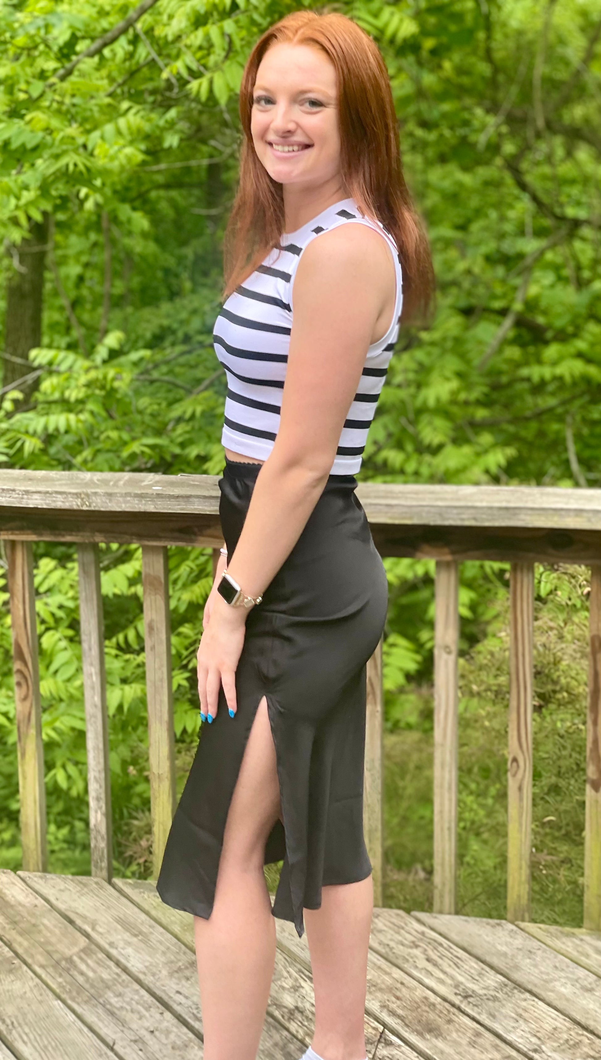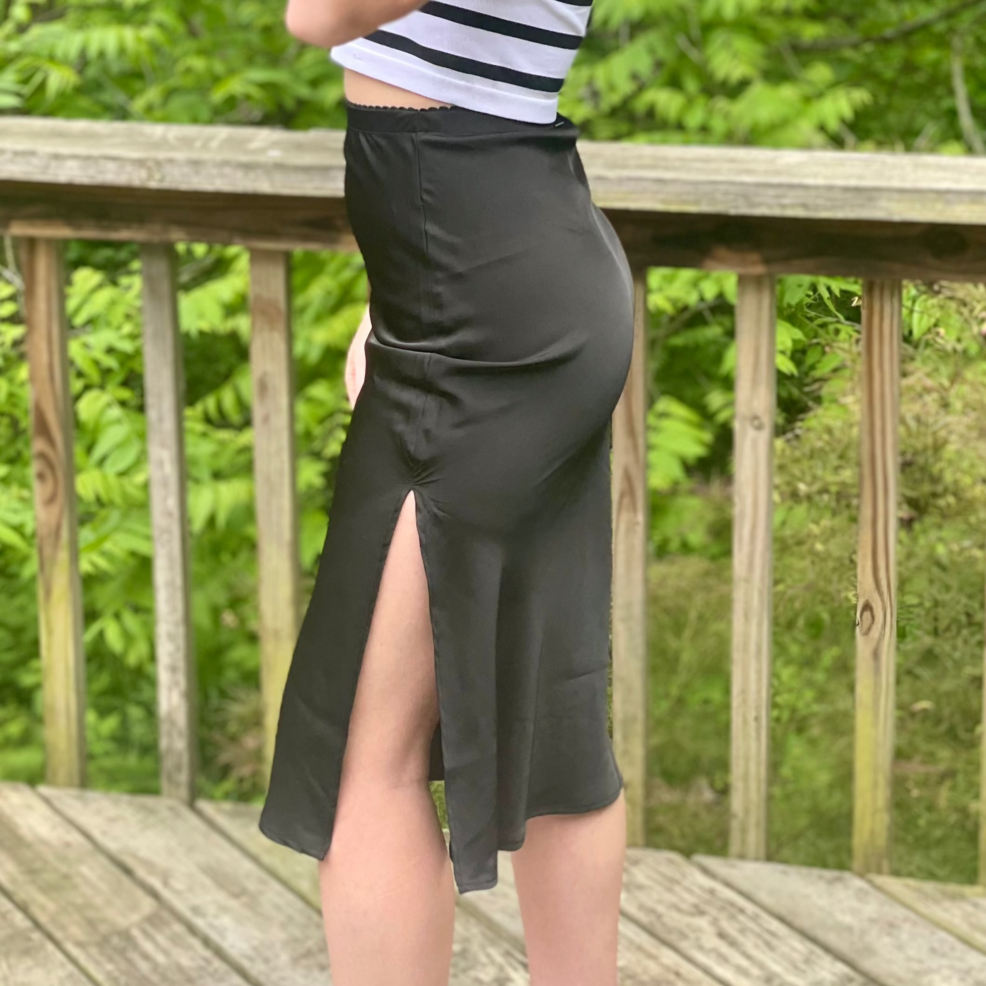 The Sunset Twirl Skirt dances with every step in luxuriously silky fabric that catches the light as you move. This playful midi-length design features a flirty side slit and delicate scalloped waistband for extra charm. Breezy and flowy, it's the perfect piece for twirling from daytime adventures into evening escapades!