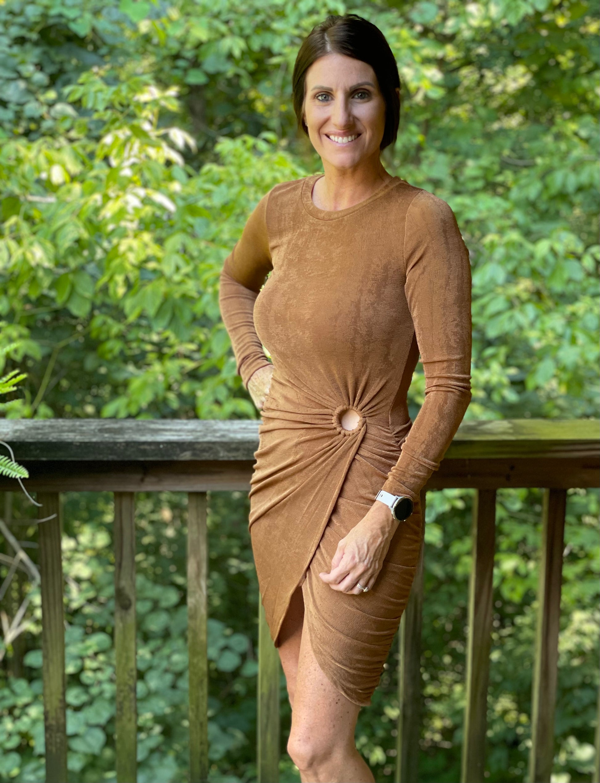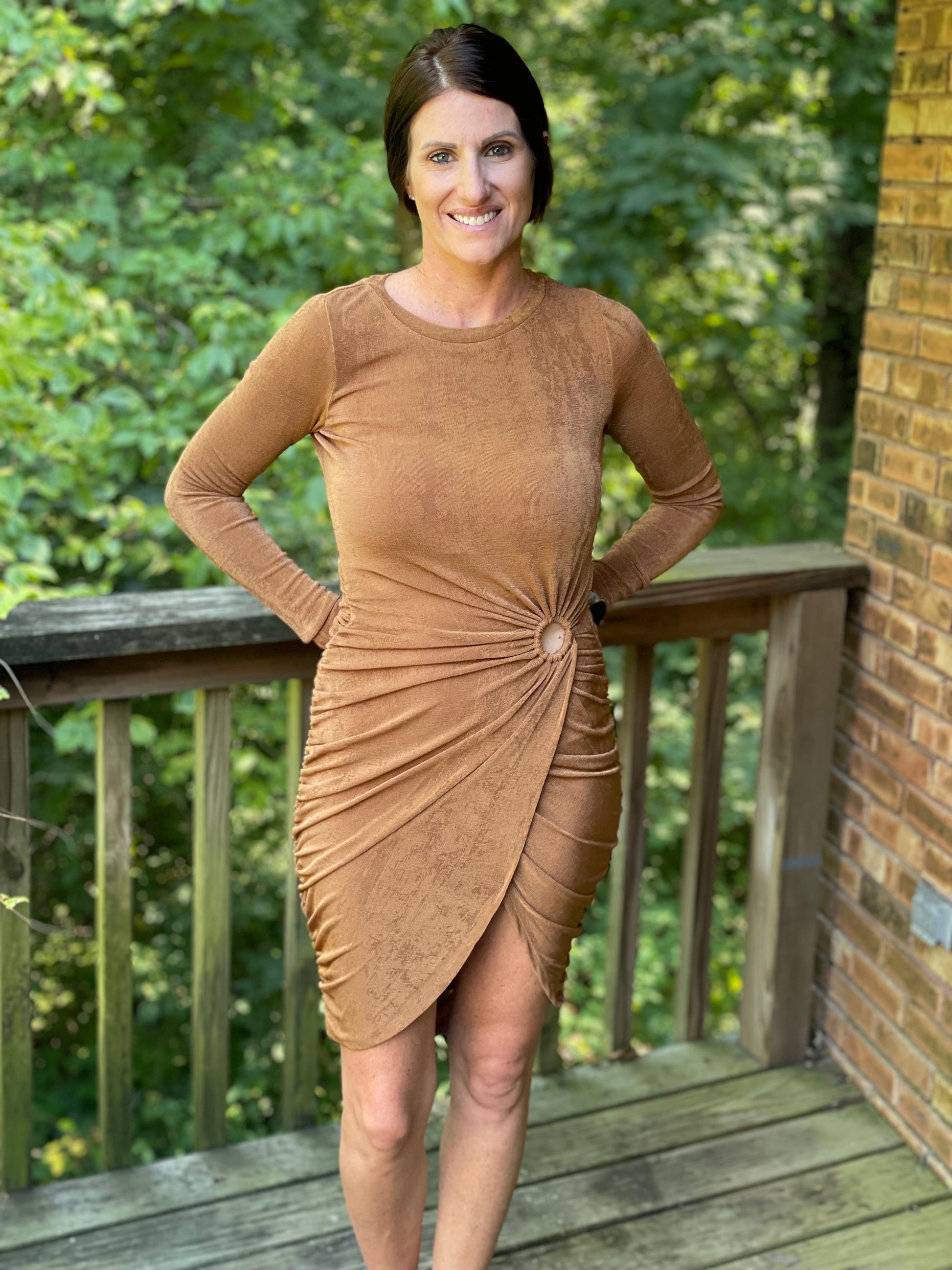 Turn heads in The Chardonnay Dress, designed to flatter every curve with a cute open detail and a daring slit up the middle. Its long sleeves balance out the playful front, while the stretchy, comfortable fabric ensures you can dance the night away with ease. Perfect for your next night out, this dress combines style and comfort effortlessly.