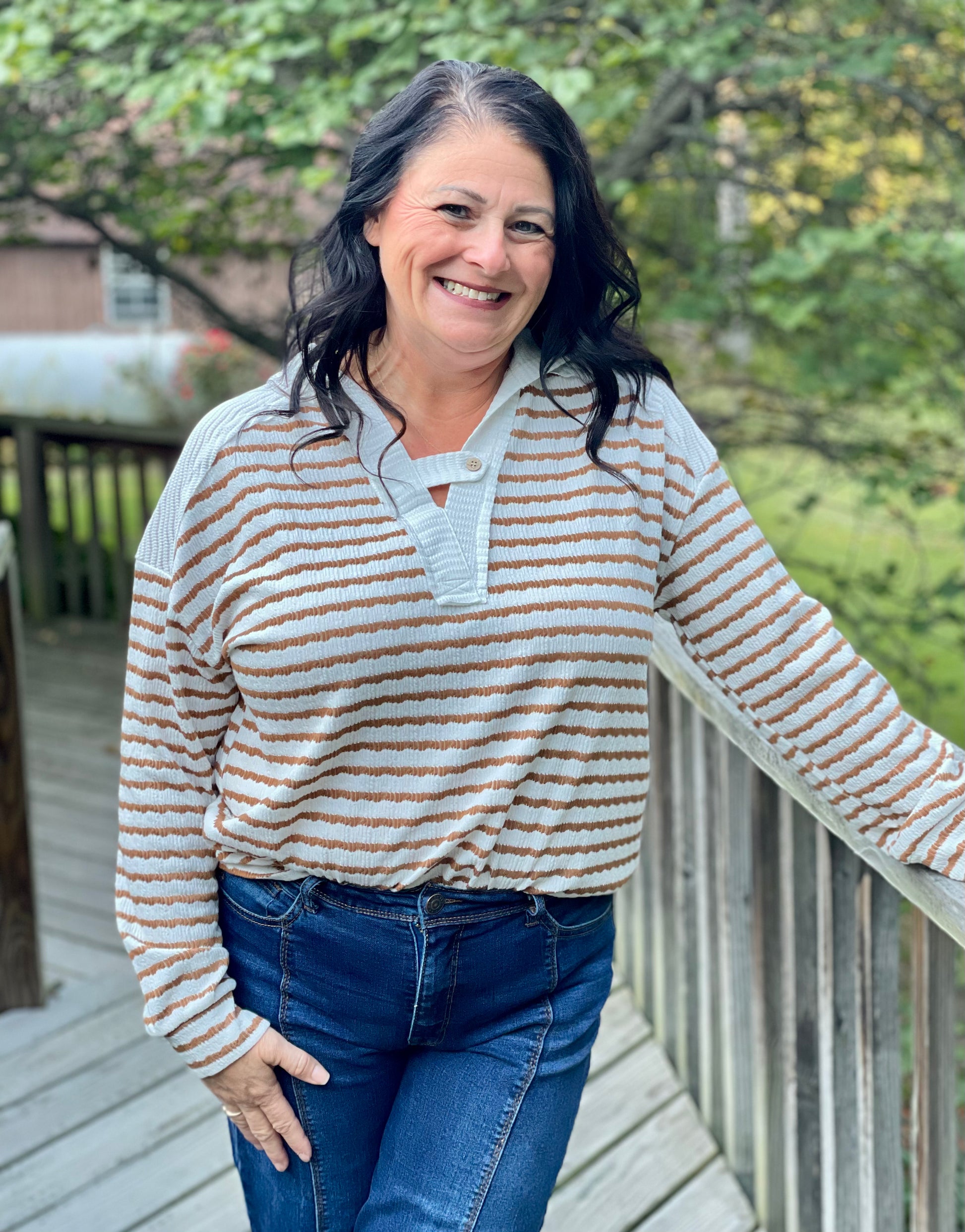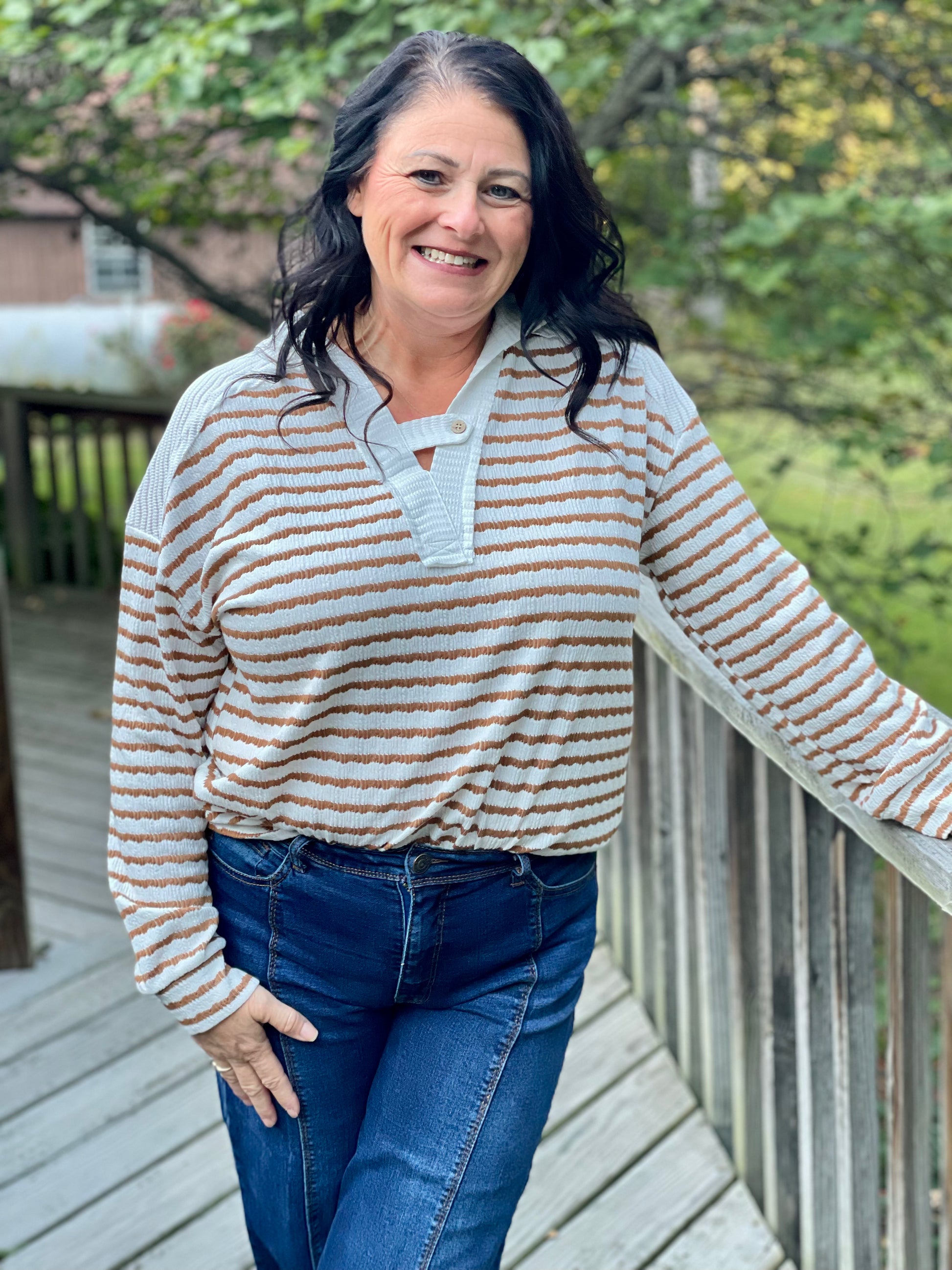 Cozy meets cute in The Cinnamon Swirl Top! With playful brown and white stripes and a flirty V-neck topped by a buttoned strap, this lightweight hooded top is your new go-to for comfort. Crafted from super soft, stretchy ribbed fabric, it moves with you all day long. Perfect for layering or lounging, it adds a swirl of charm to every casual look.