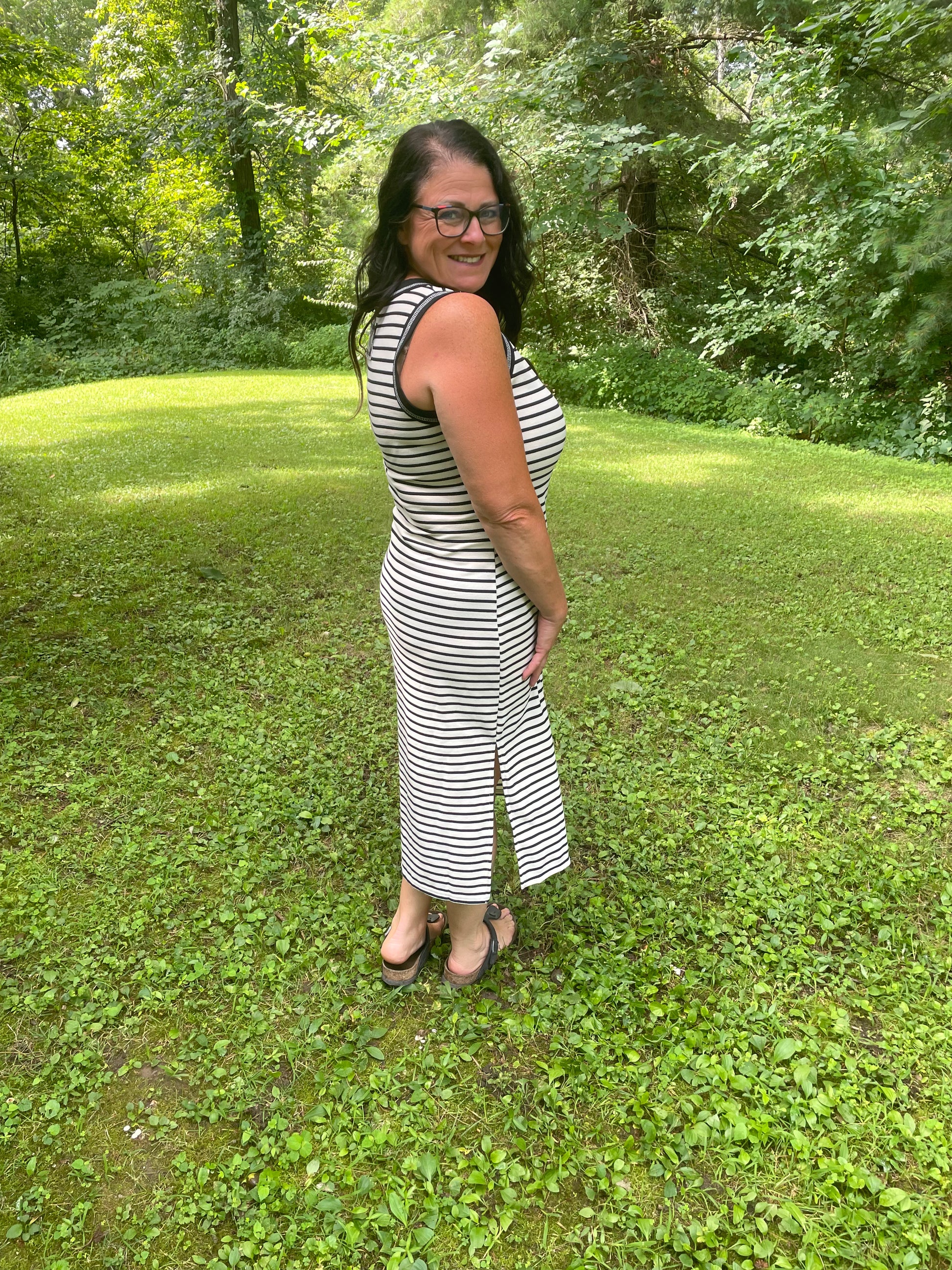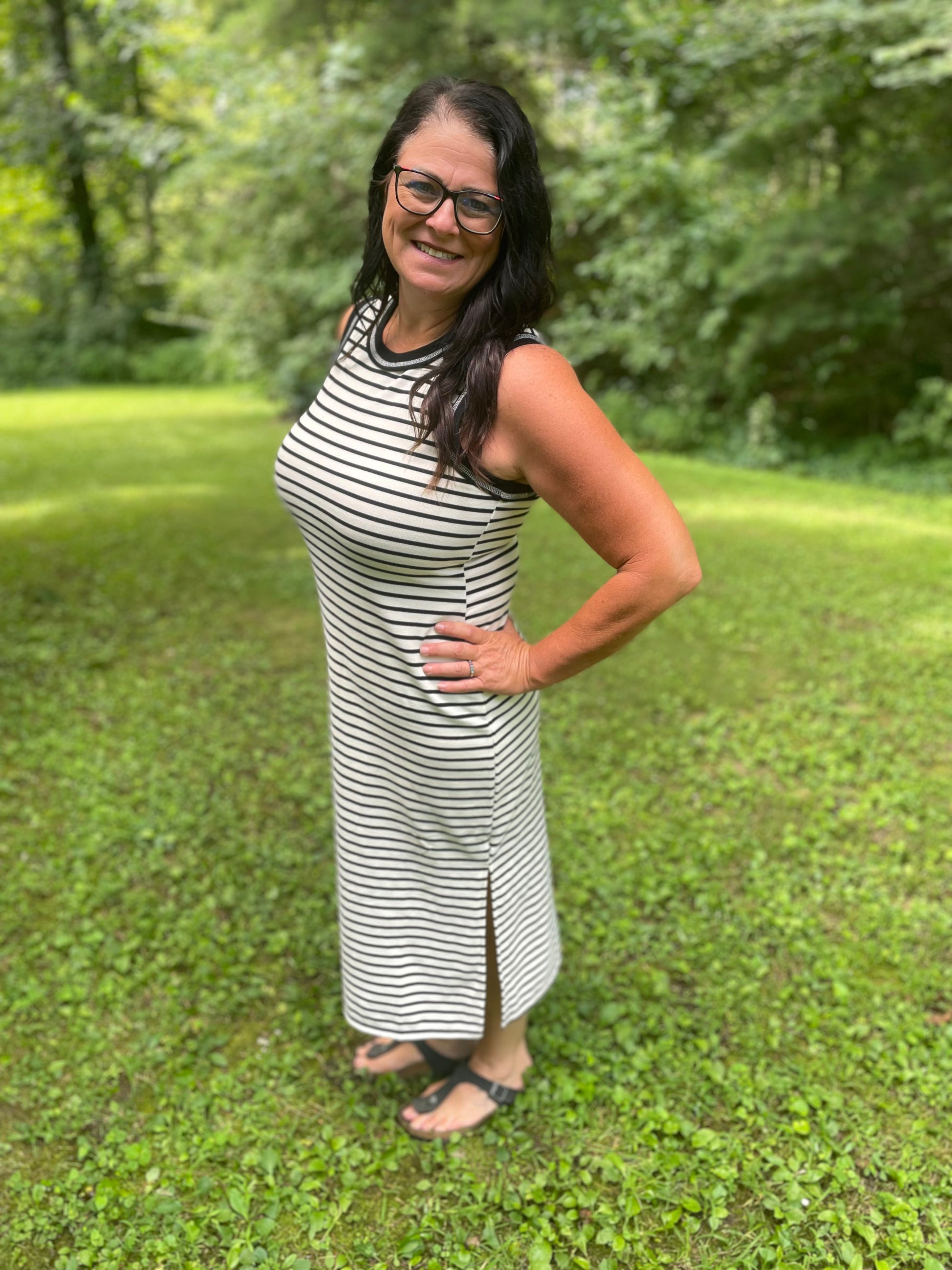 The Downtown Stripe Dress brings playful stripes to a flattering maxi length with a comfy, soft, and stretchy fit. Featuring a high neck, thick straps, and a side slit, it’s designed to hug your shape just right. Whether you're dressing it up for a night out or keeping it casual, this form-fitting beauty lets you switch styles effortlessly.