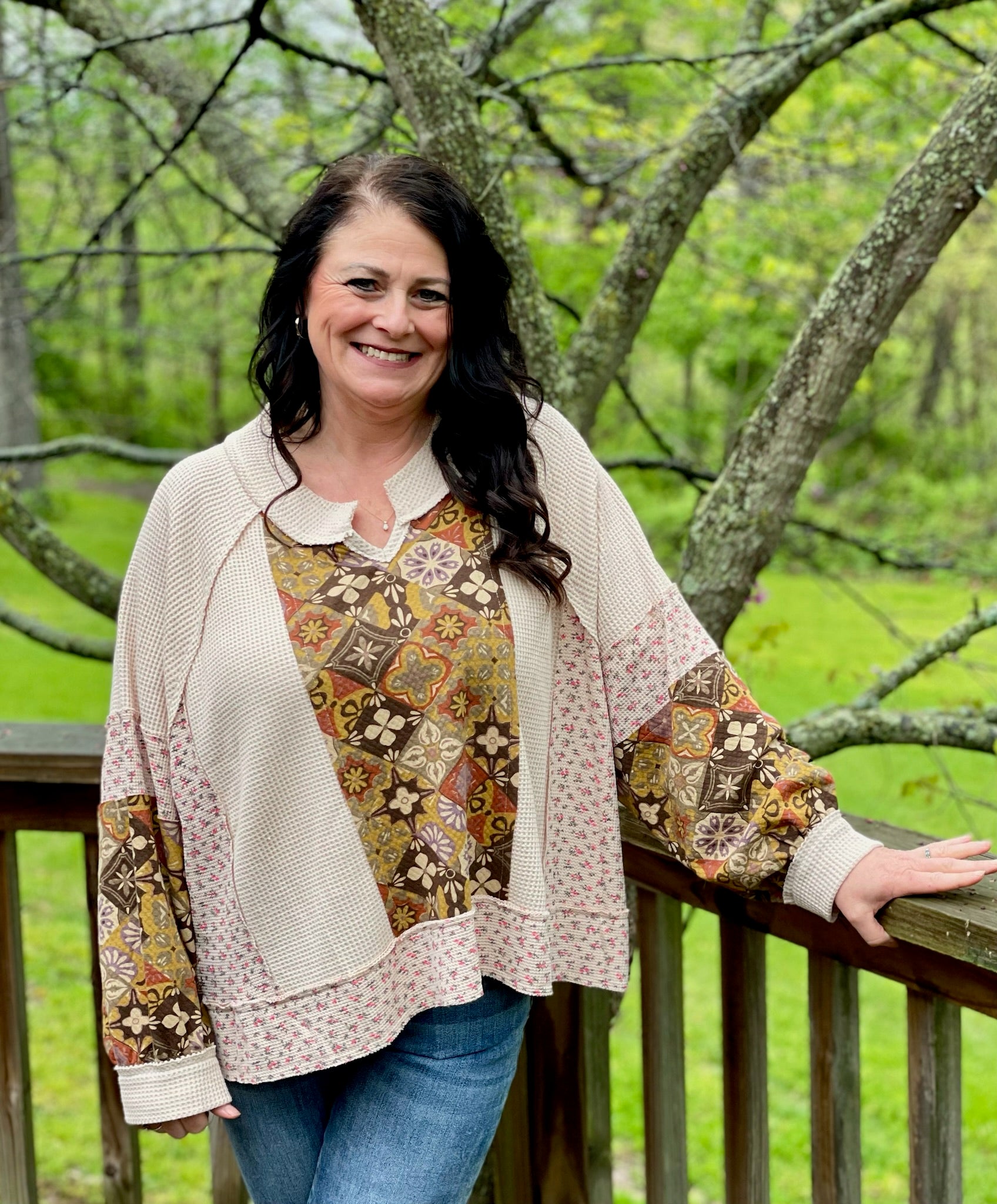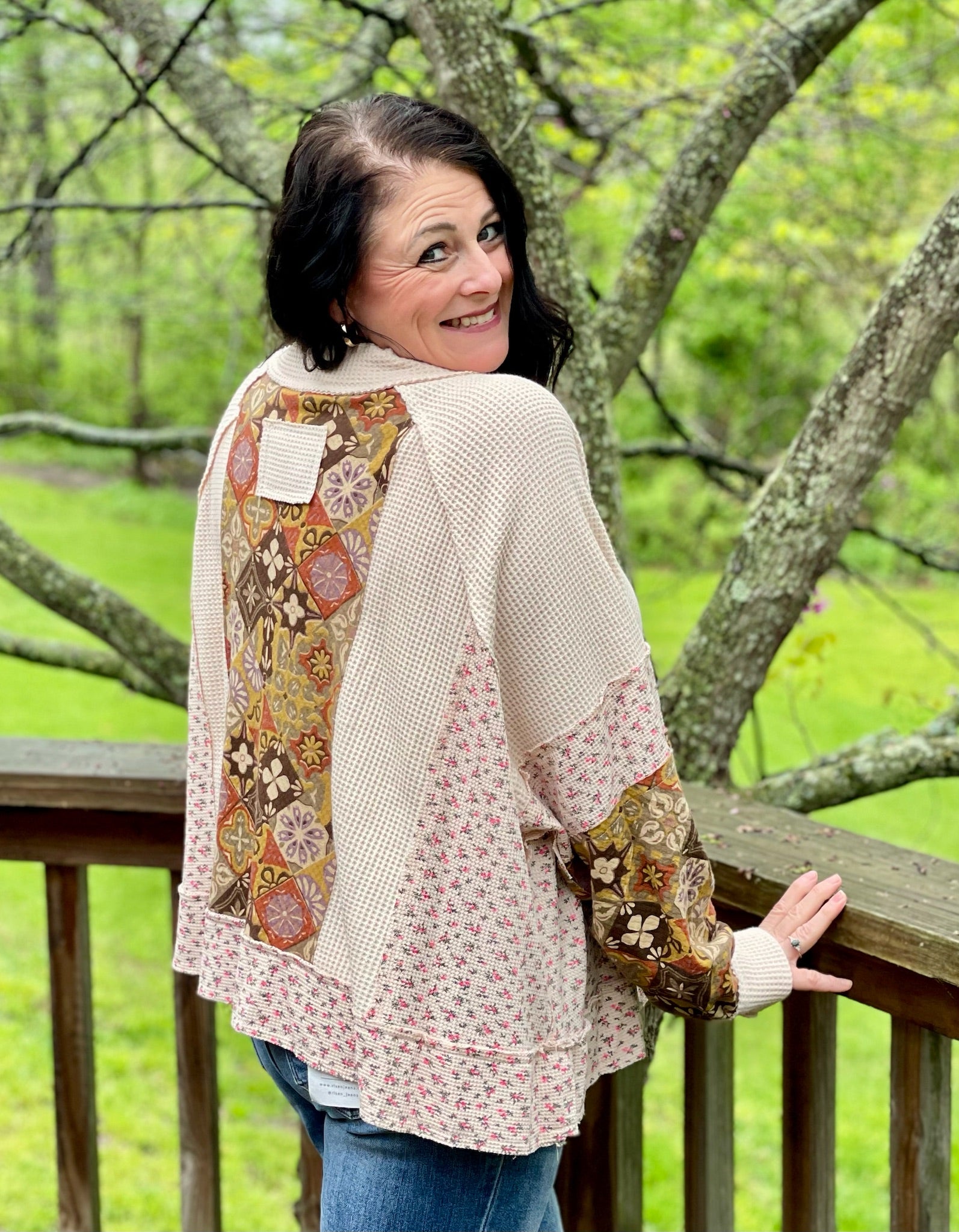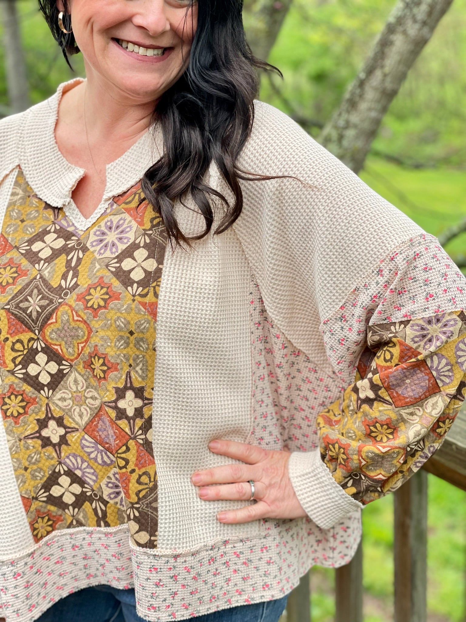 Stay cozy and stylish in the Garden Mosaic Top. Made with a calico print and thermal waffle knit, this oversized top features a slight v neck and a longer back for a unique touch. Embrace your free-spirited side with the playful mosaic print. Perfect for your next winter adventure!