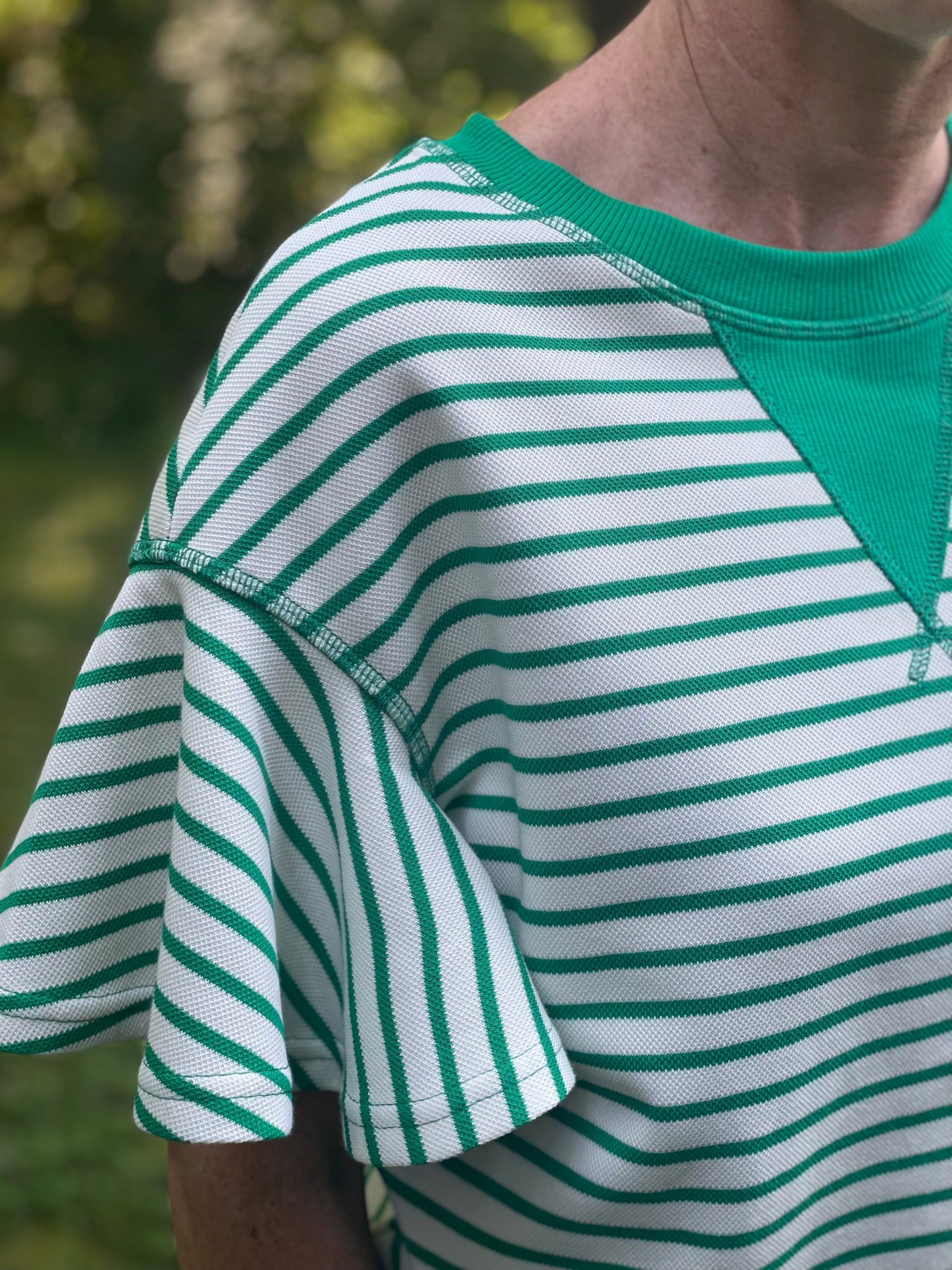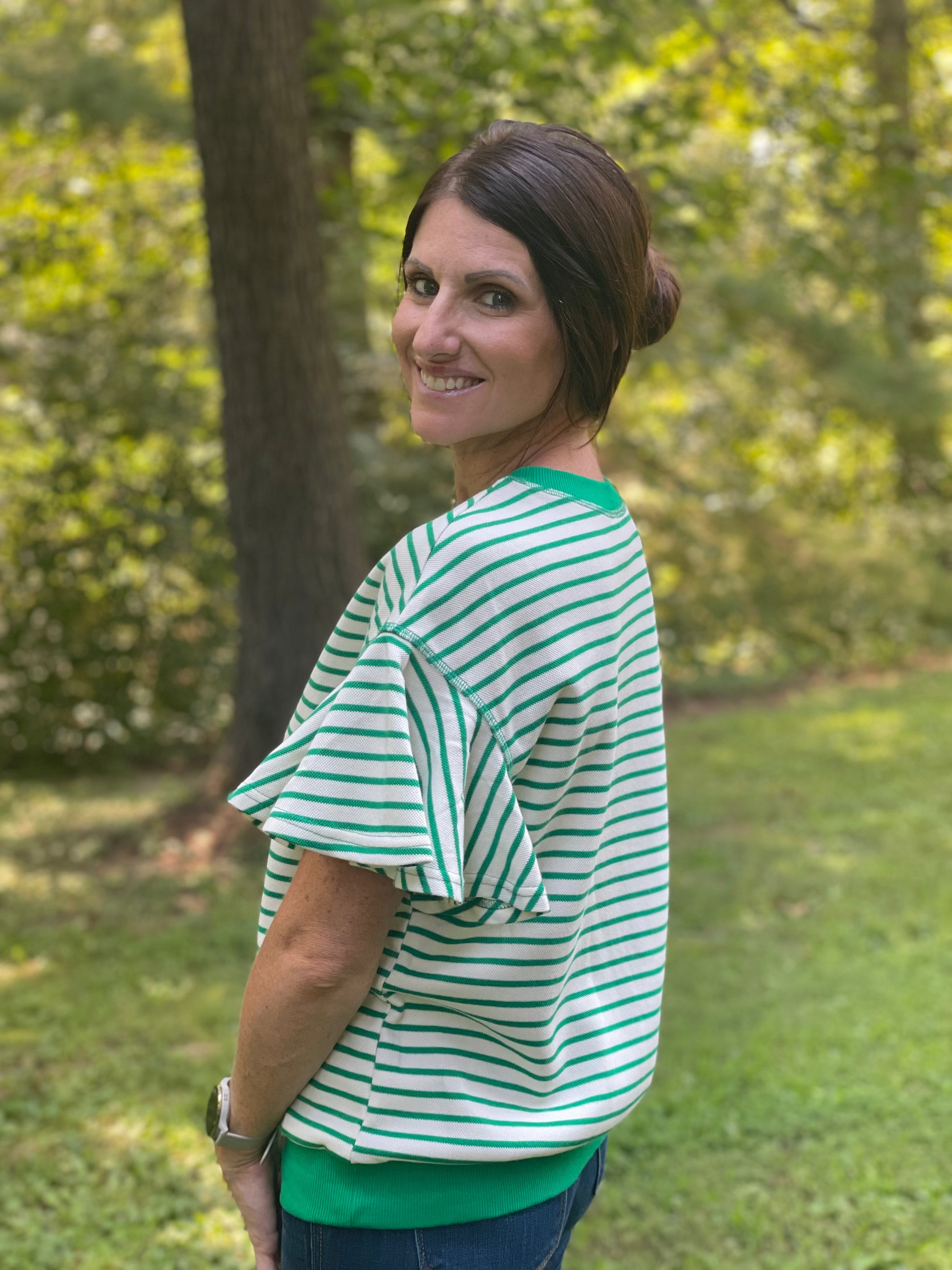 The Garden Party Top is a delightful blend of playful puff sleeves and elegant green and white stripes. Soft and comfortable, it offers a sophisticated look that effortlessly complements any outfit. Perfect for adding a fun yet polished touch to your wardrobe, this top is your go-to for stylish versatility.