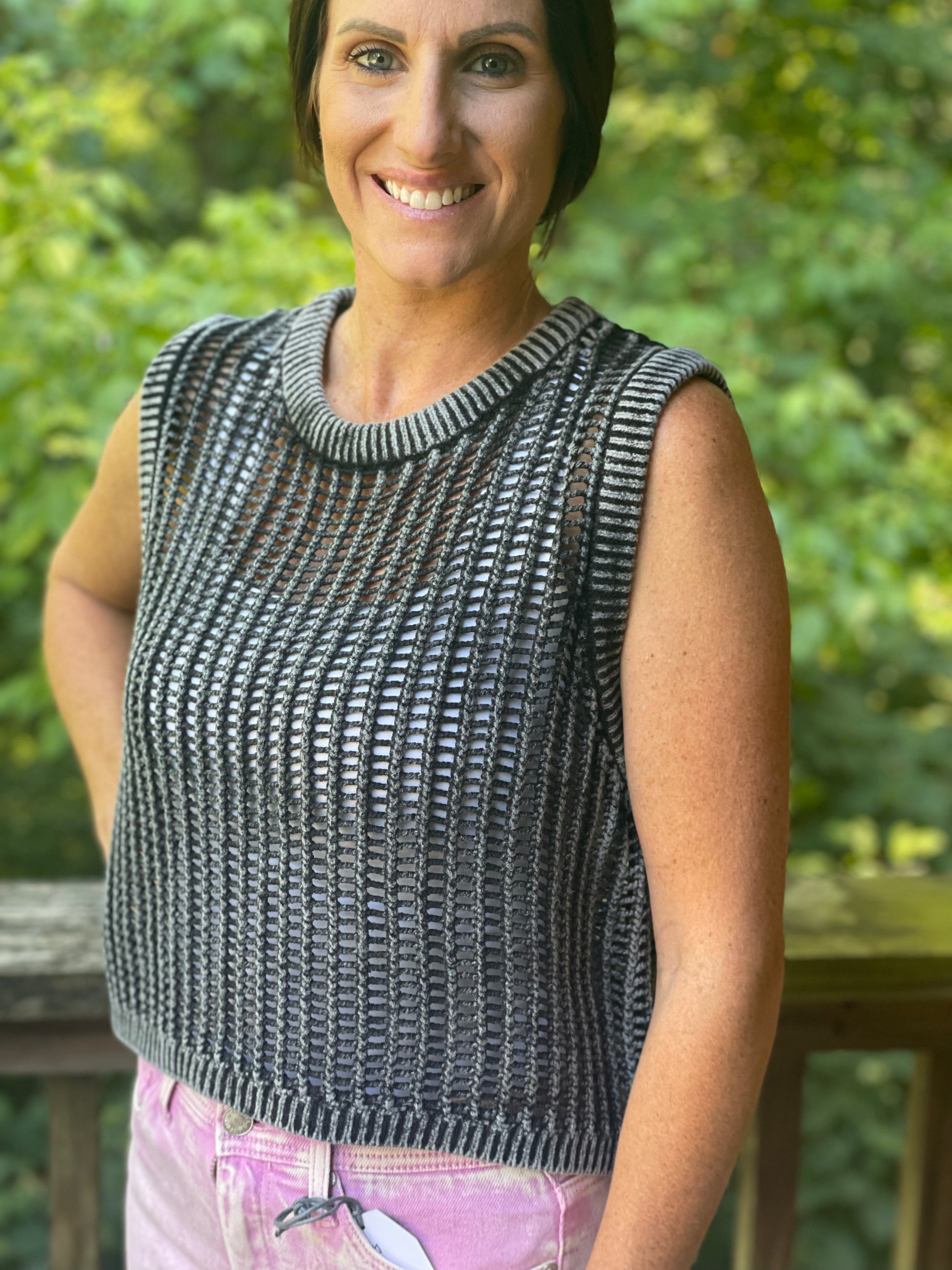 The Gridlock Vest is your new go-to for layering with attitude. This fun, cropped piece features an open-knit design that's soft and comfy, making it a breeze to throw over any outfit. Whether you're dressing up or keeping it casual, it pairs effortlessly with everything in your wardrobe to add a playful, edgy twist.