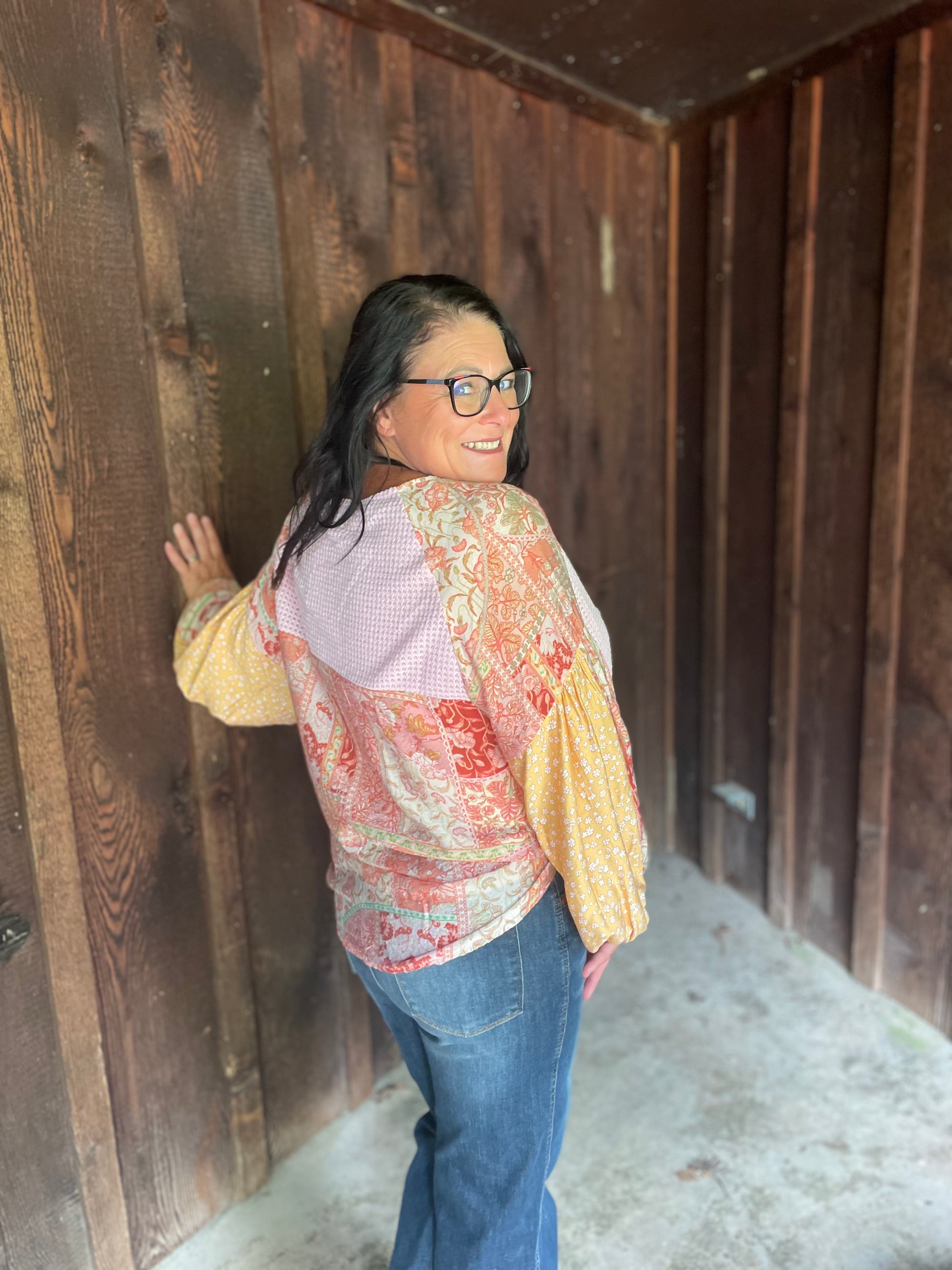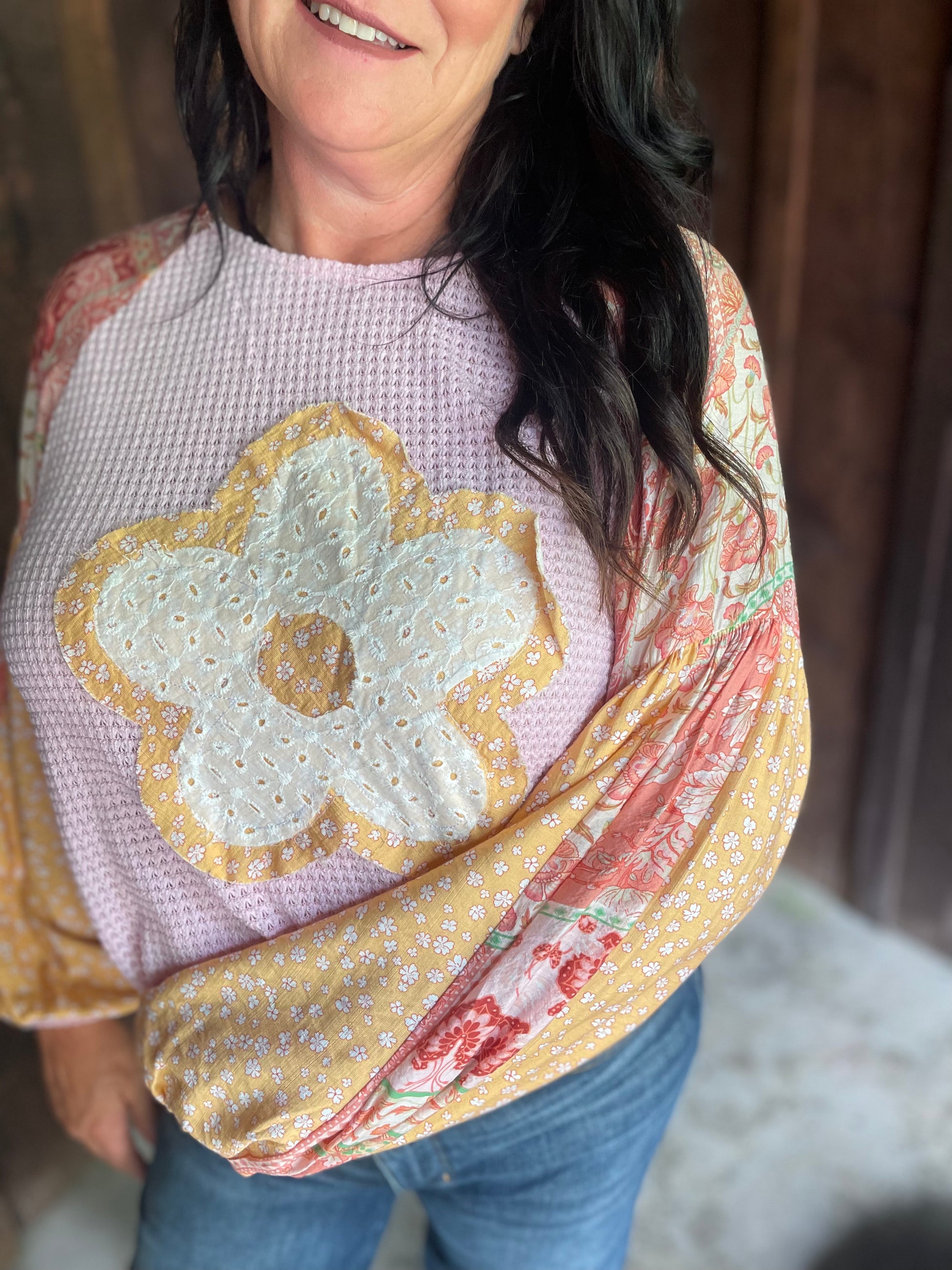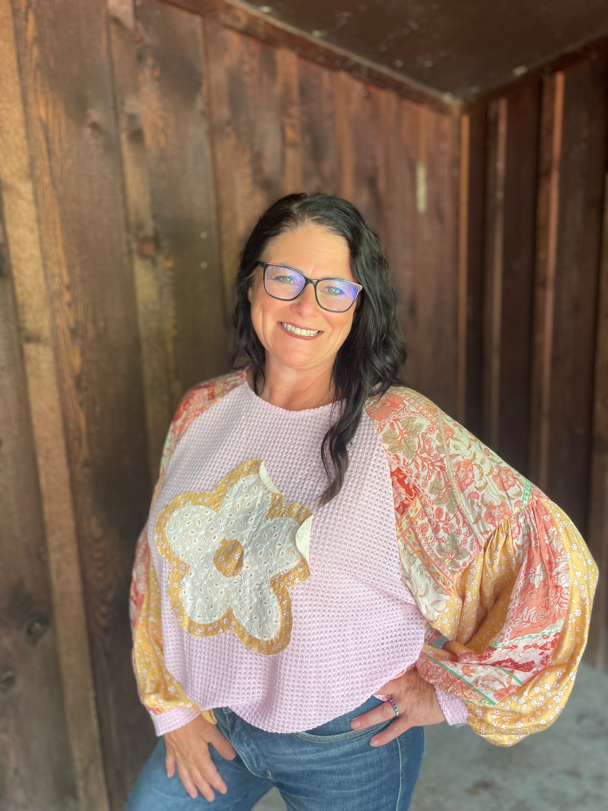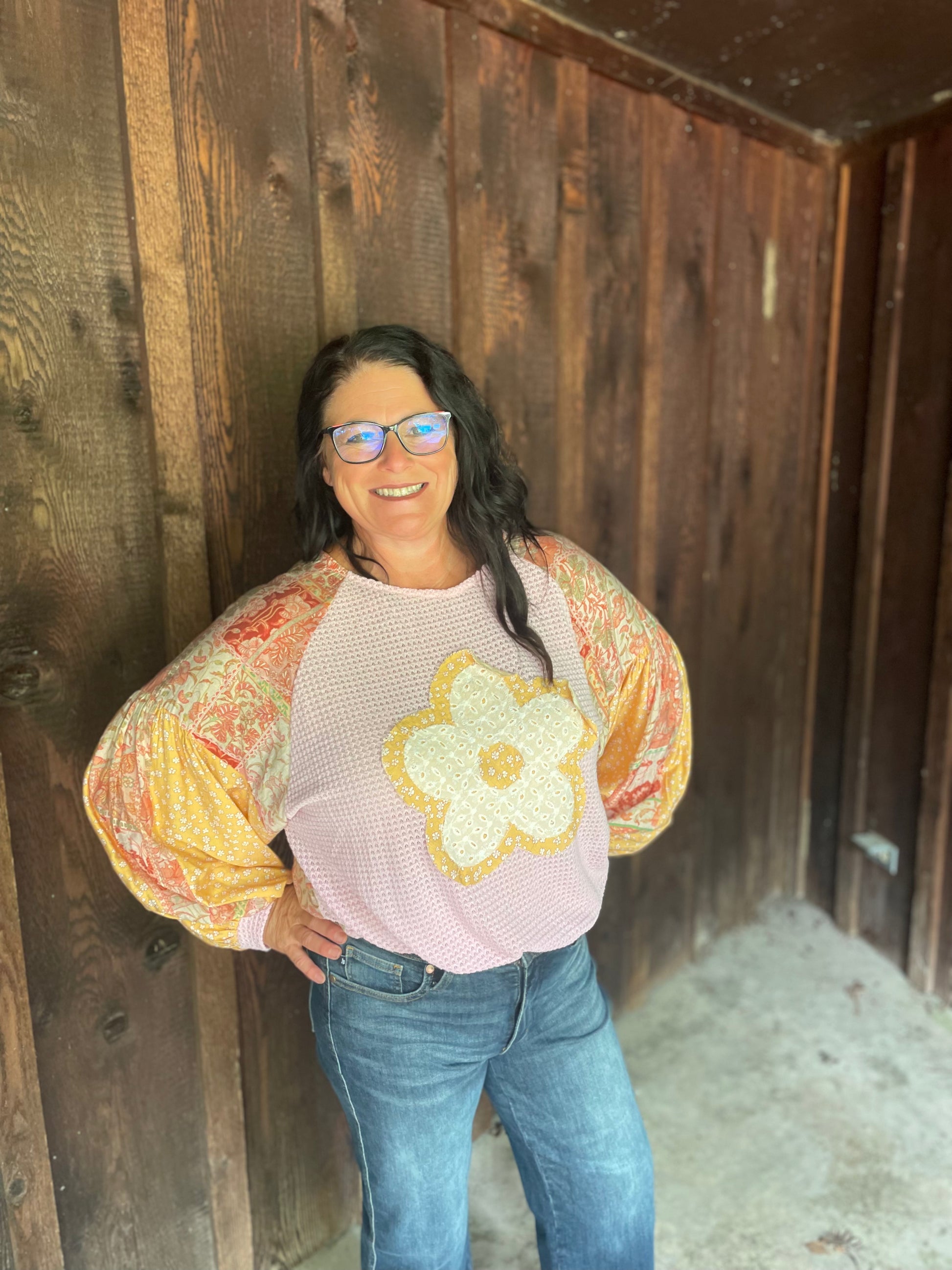 The Meadow Lane Top is your new go-to for effortless charm. Crafted from super lightweight ribbed knit, it feels soft and comfy all day long. Its flowy fit and playful balloon sleeves add a breezy, whimsical touch, while the delicate flower patch on the front brings a pop of sweet detail. Perfect for those who love comfort with a bit of fun flair!