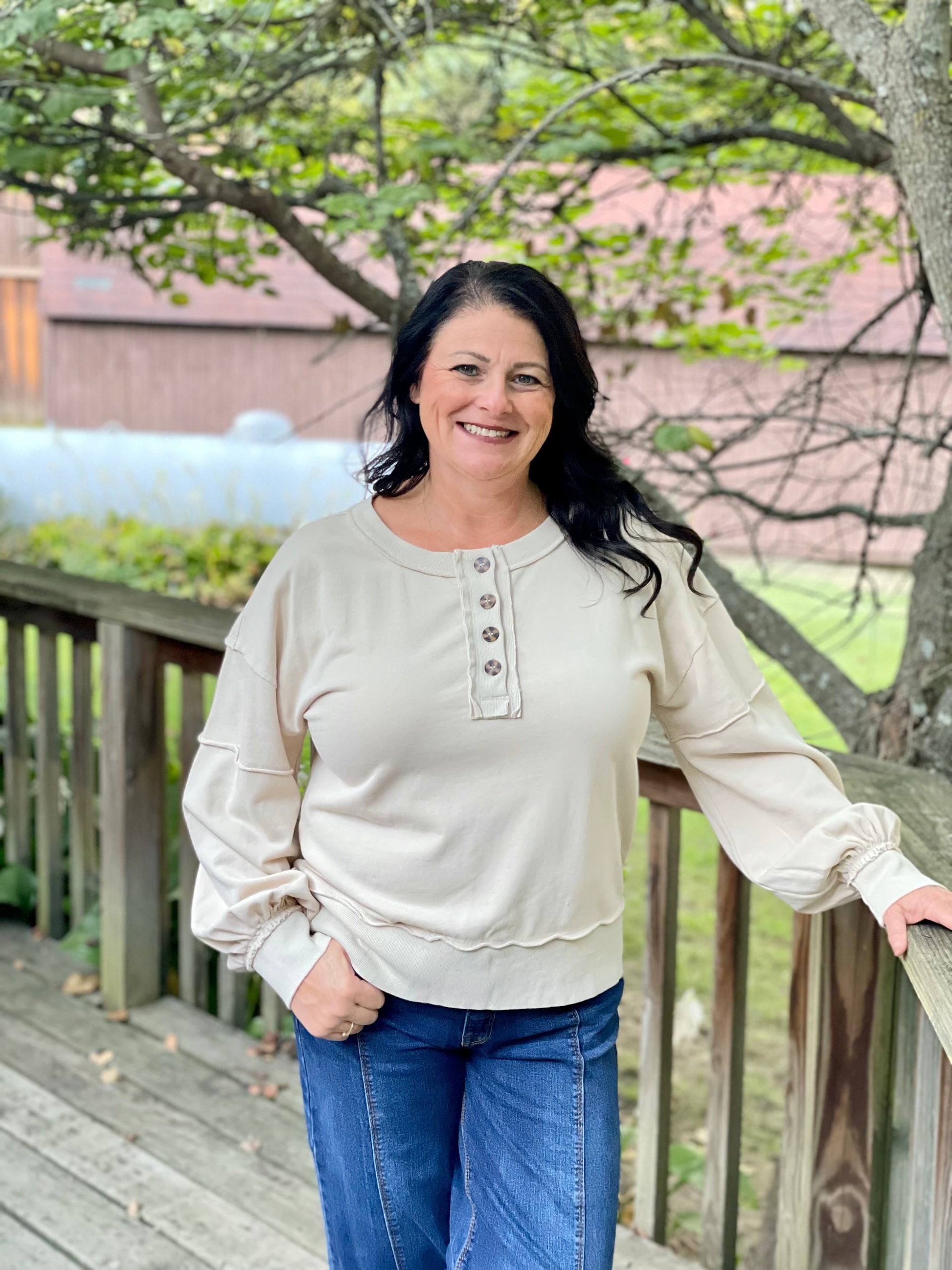 The Oatmilk Button Top is your new favorite go-to for casual days. In a cozy oat-like color, this stretchy, ultra-soft top features a button V-neck and long sleeves that keep things comfy yet cute. The lightweight fabric and thick band at the bottom add playful detail and a perfect fit, while subtle seam accents give it a little extra charm. Pair it effortlessly with denim for an easy, laid-back look that feels as good as it looks.