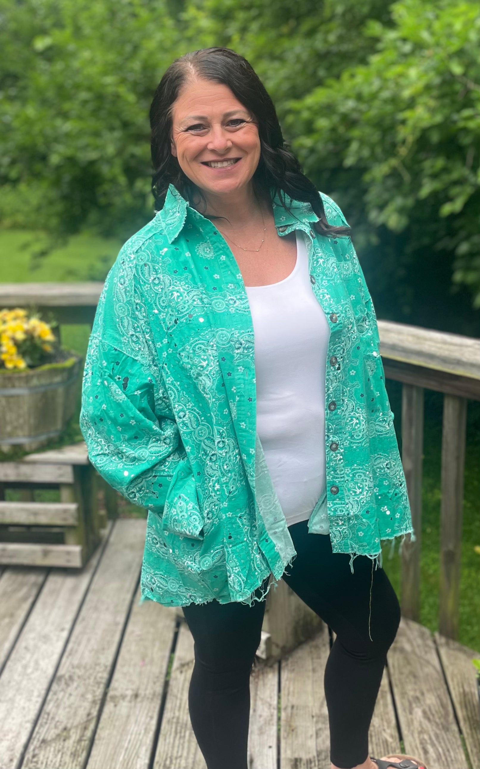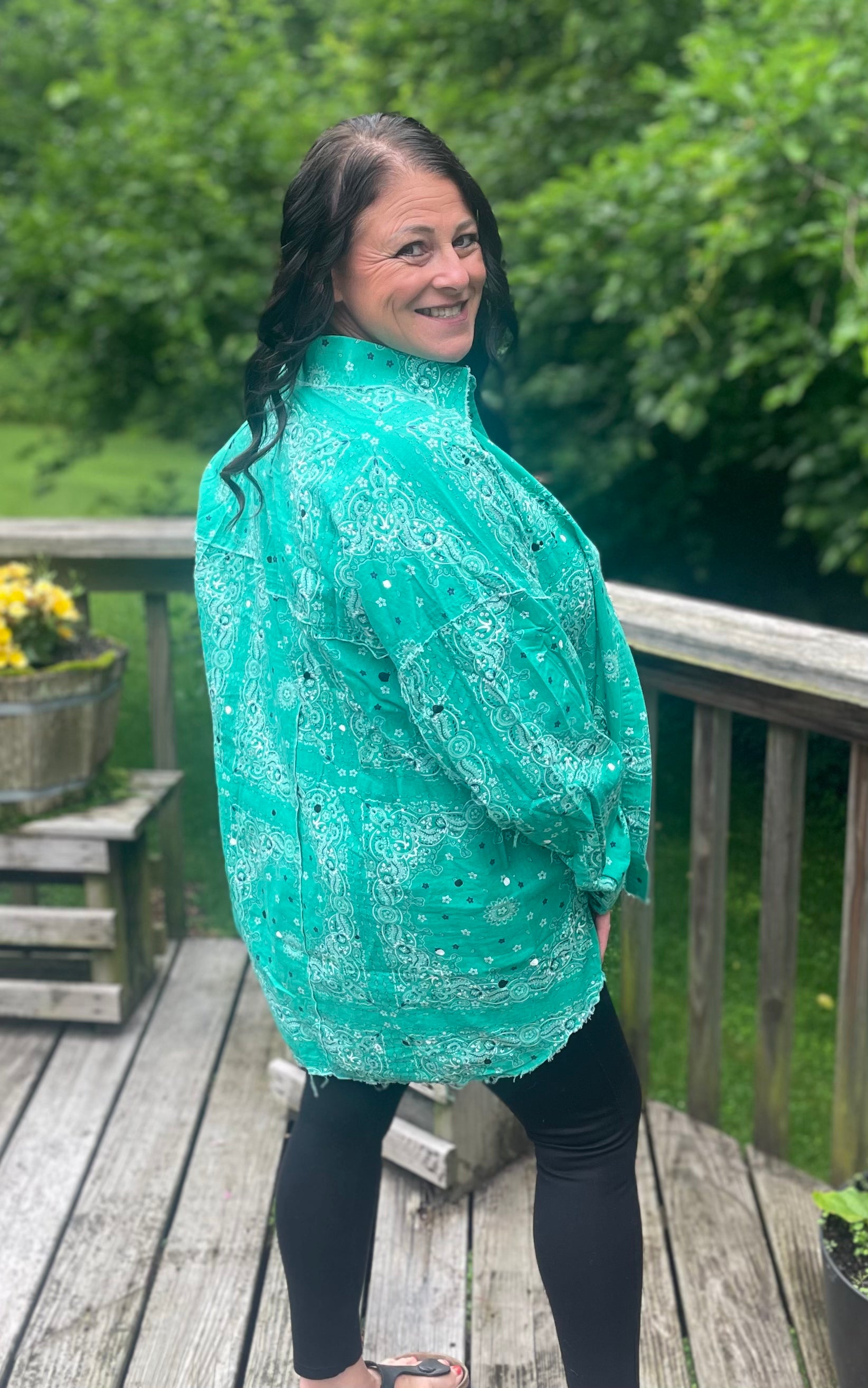 The Paisley Pop Top brings a fun twist to your wardrobe with its vibrant bandana print and breezy oversized fit. Crafted from soft, lightweight fabric, it feels comfy all day long. The raw hem adds a touch of casual cool, making it perfect for playful, laid-back days.