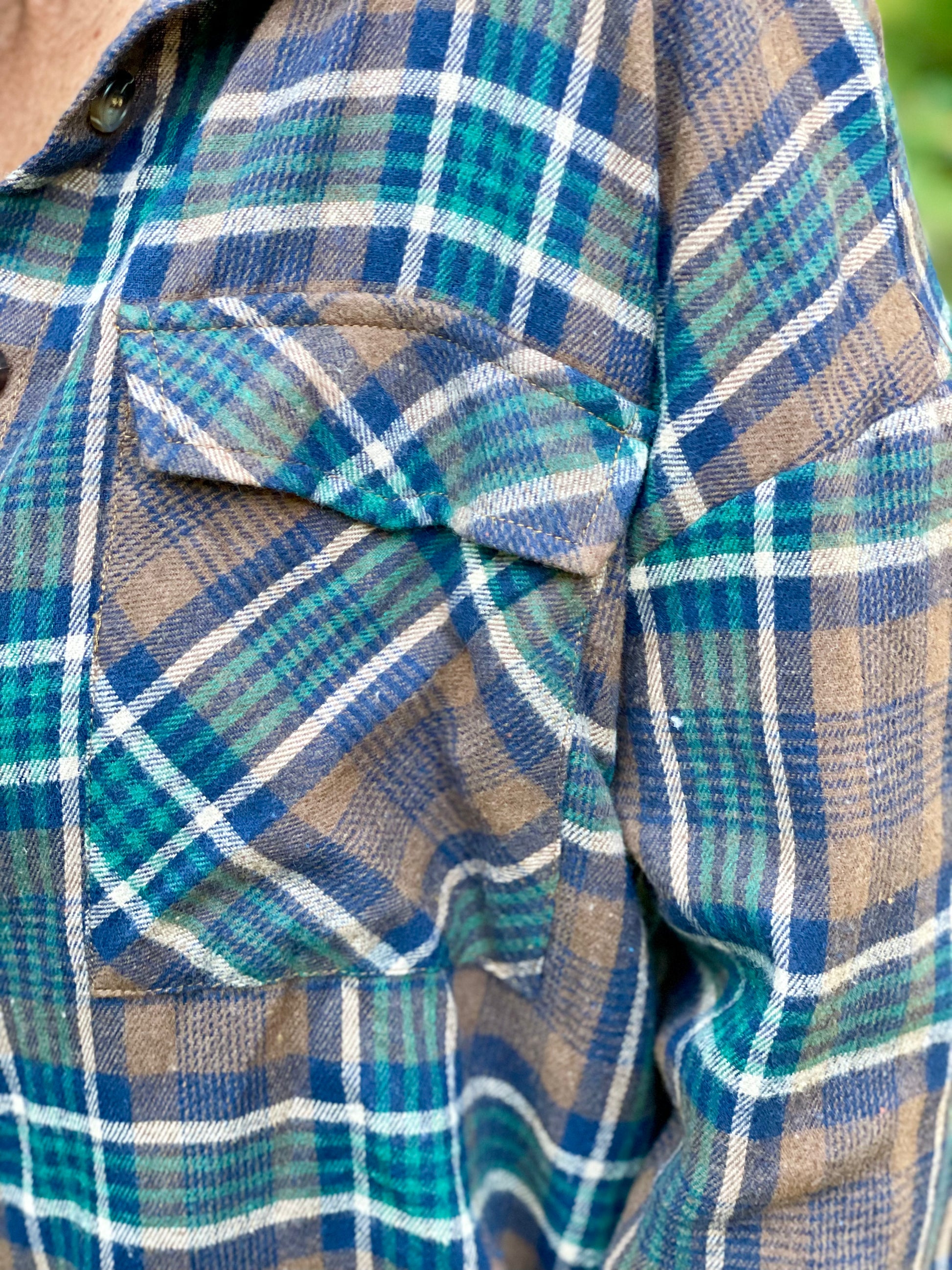 The Timberline Flannel wraps you in cozy earthy green and deep brown tones, perfect for any adventure. Soft and lightweight, it feels like a gentle hug all day long. With buttons running all the way down and a stylish longer back, this flannel blends comfort with a touch of playful charm—ready to keep you comfy whether you're exploring trails or lounging at home.