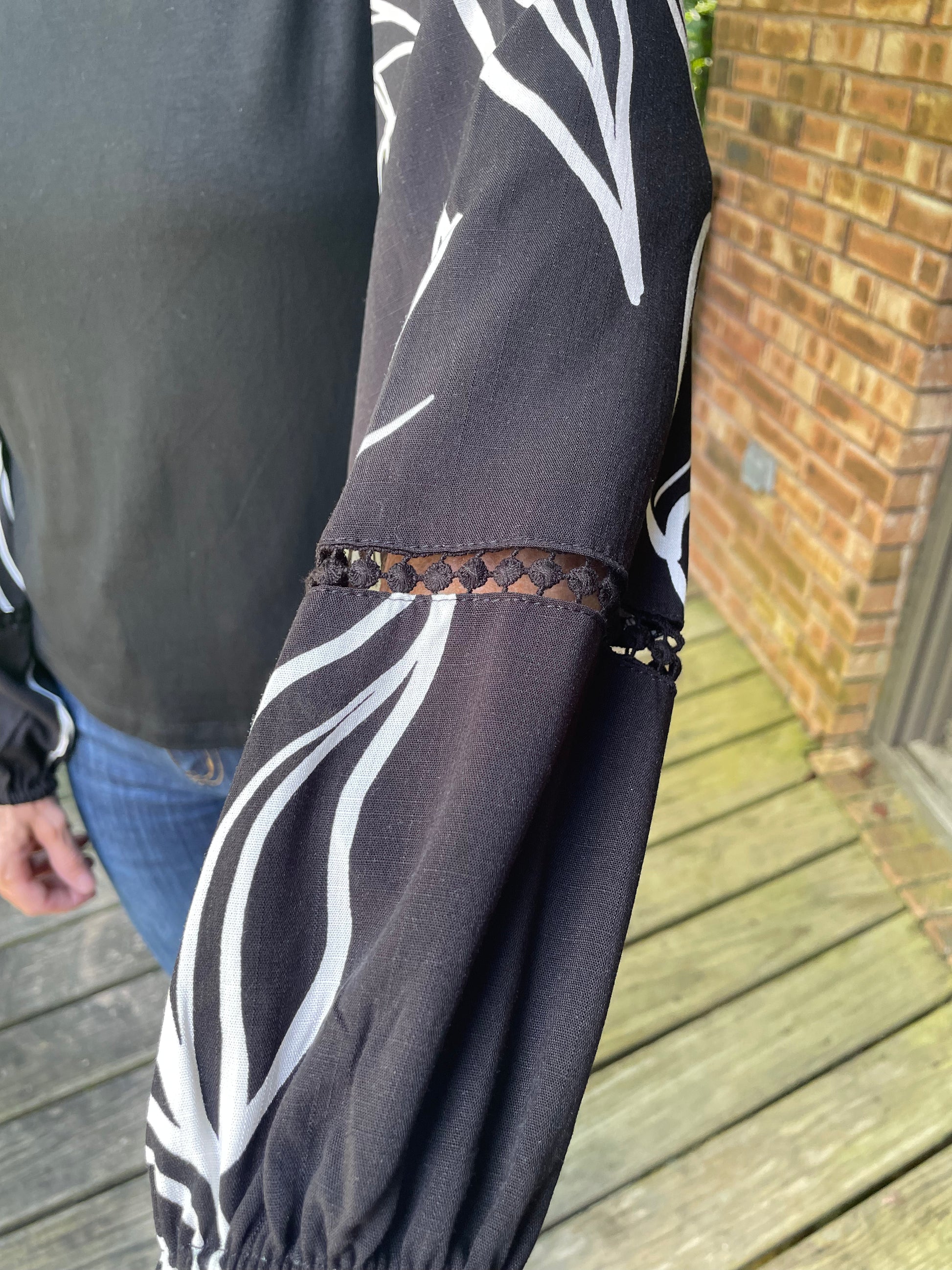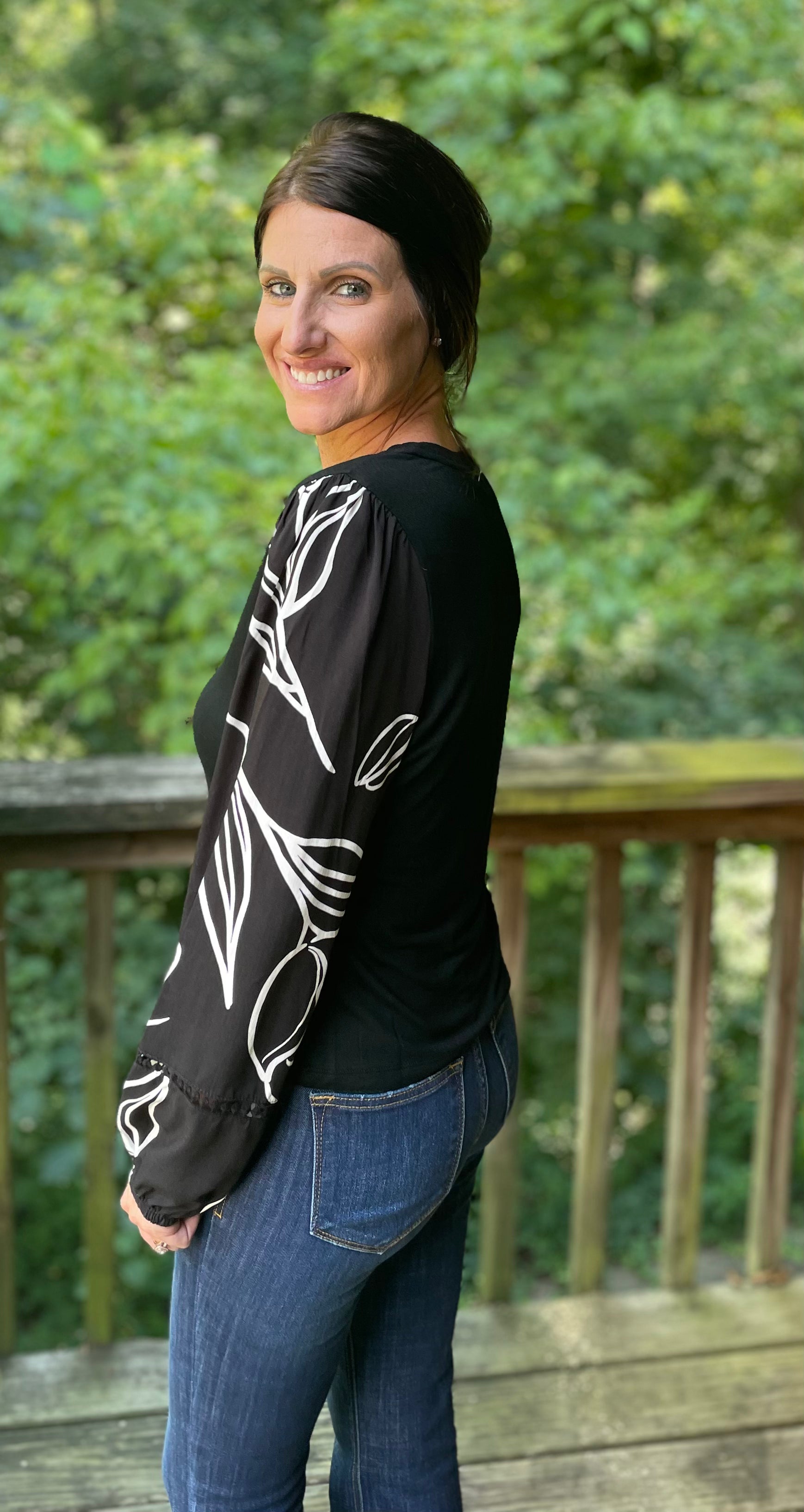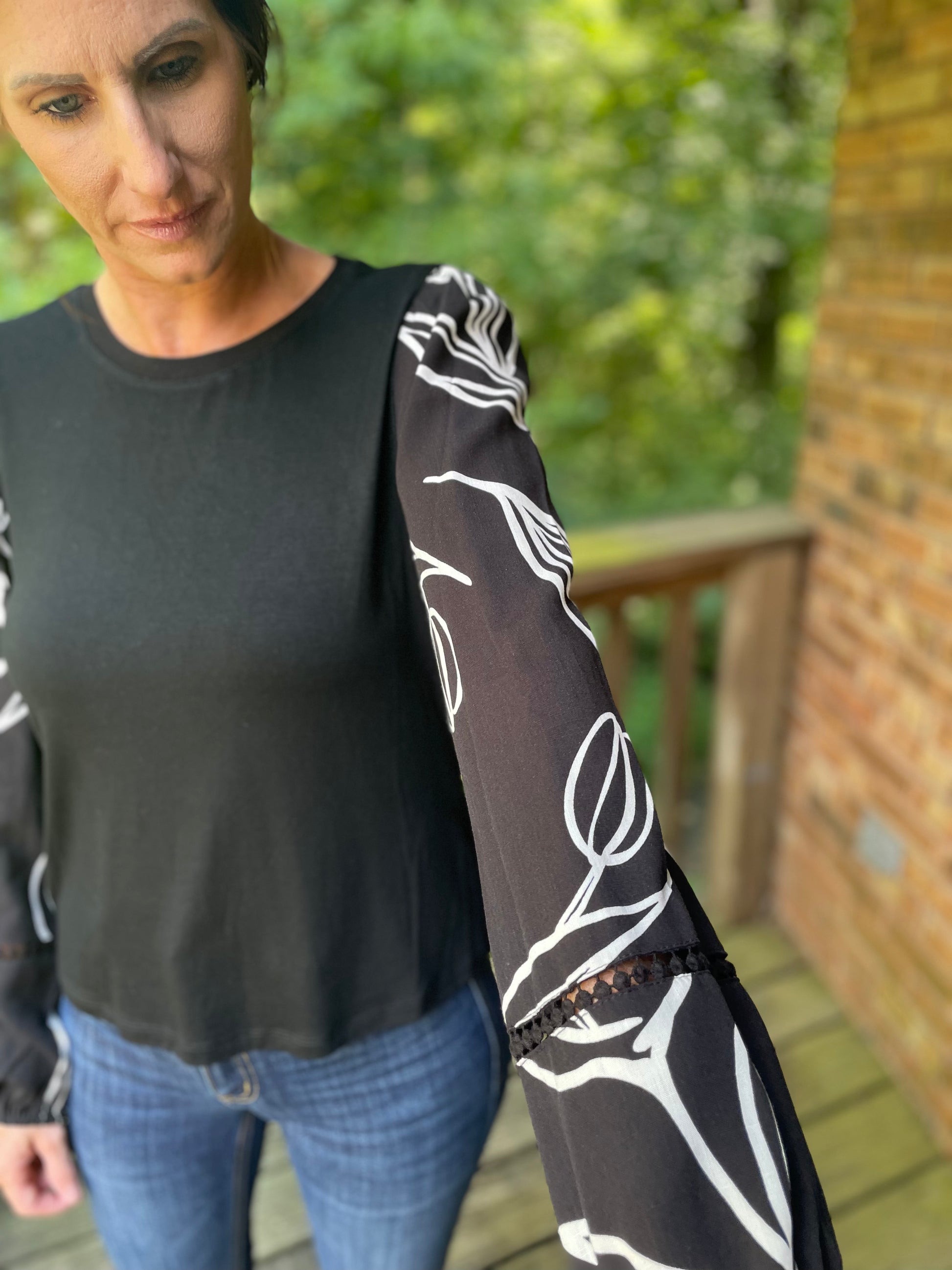 The Urban Lines Top brings playful elegance with its long, flowy sleeves featuring an abstract print that adds a unique touch. Crafted from buttery soft fabric, it drapes beautifully for a sophisticated yet relaxed look. Perfectly paired with denim, this top effortlessly combines comfort and style for any casual outing or chic daytime event.