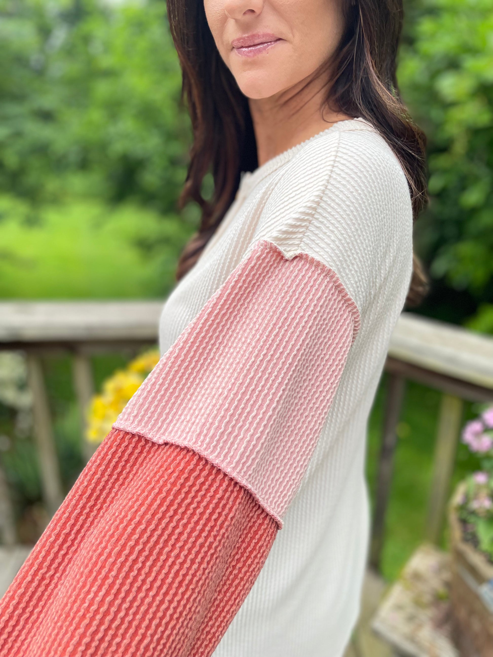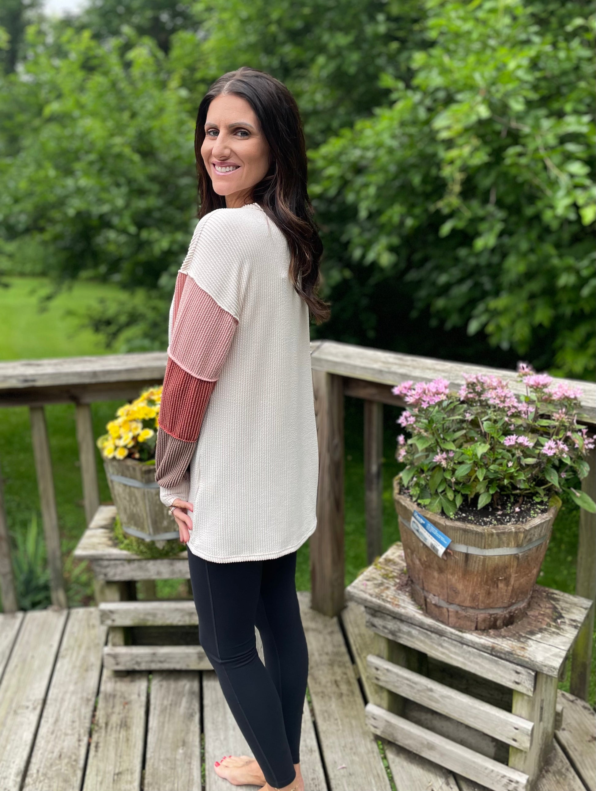 This playful ribbed top features a fun color block design in white, pink, and rust. Its button V-neck adds a flirty touch, while the soft, stretchy, and bouncy fabric keeps you comfortable and light all day long. Perfect for adding a pop of color and a bit of bounce to your casual wardrobe!